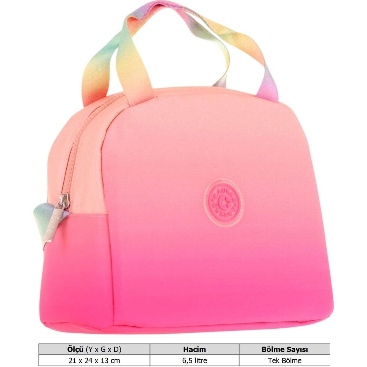 Bu şık ve kullanışlı beslenme çantası, kız çocukları için özel olarak tasarlandı! somon pembe tonlarındaki göz alıcı rengi ve renk geçişli deseniyle hem okulda hem de piknikte tarzını konuşturacak.