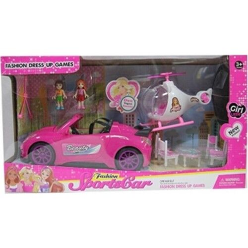1 adet üstü açık araba 1 adet tente 1 adet helikopter 2 adet mini bebek 1 adet masa 4 adet sandalye