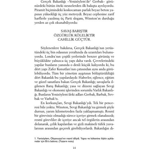 Parti’nin dünya görüşü, onu hiç anlayamayan insanlara çok daha kolay dayatılıyordu. (...) Her şeyi yutuyorlar ve hiçbir zarar görmüyorlardı çünkü tıpkı bir mısır tanesinin bir kuşun bedeninden sindirilmeden geçip gitmesi gibi, yuttuklarından geriye bir şey kalmıyordu.