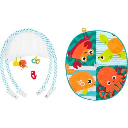 Bebeğiniz evde ya da dışarıdayken, bu jimnastik merkezinde karın üstü keyifli zaman geçirebilir. Kolayca katlanıp taşınabilen, oldukça kullanışlı aktivite merkezi okyanus temalı bir oyun matı ve bebek bezi çantasına veya bebek arabasına kolayca sığdırmak için katlanabilir iki hafif kemere sahip! Dört sevimli deniz hayvanı oyuncakları, küçük kaşifinizin dokunması, vurması ve dişlemesi için teşvik edicidir. Katlandığında tüm bu oyuncaklar da içinde kalır.
