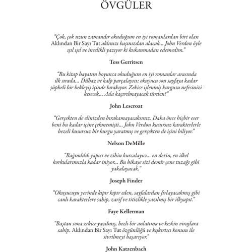 John Verdon’ın yazdığı ilk kitap olan Aklından Bir Sayı Tut, tüm dünyada büyük ses getirdi. 25 farklı dile çevrilen ve yayınladığı ülkelerin büyük bir çoğunluğunda en çok satanlar listesine girmeyi başaran Aklından Bir Sayı Tut, 40’lı yaşlarında New York Polis Departmanı’ndan emekli olmuş David Gurney’in hikâyesini anlatıyor. John Verdon’ın ilk romanı olma özelliğini taşıyan bu kitap, yazarın özellikle hayal gücünü büyüleyen yönüyle ortaya çıkıyor. Polisiye türünü okumaktan zevk alanlar için bir altın madeni görevi gören kitap akıcı dili ile göz açıp kapayıncaya kadar bitiyor. Sıkıysa yakala tarzındaki kitap, okuyucuların son sayfaya kadar tahmin yürütmesini sağlıyor.
