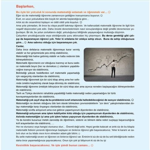 “Başlarken, Bu öyle bir yolculuk ki sonunda matematiği anlamak ve öğrenmek var... Eğer siz de matematiği öğrenme zamanınızın geldiğine inanıyorsanız buyurun. Evet, en uzun yolculuklara bile küçük bir adımla başlandığına göre... Artık siz de cesaretinizi toplayın ve ciddi ciddi yola koyulun. Yola çıkmadan önce bu olaya pozitif bakmayı öğrenin. Ve kafanızdaki matematik öğrenme ile ilgili tüm negatif düşünceleri yok edin. Daha önceki denemelerinizin nasıl sonuçlandığına değil şimdiki denemenize yoğunlaşın. Bir de, bu yolun zorluklarını değil, yolculuğunuz bittiğinde yaşayacağınız mutluluğu düşünün. Çalışırken yorulduğunuzda veya sıkıldığınızda şunu aklınızdan hiç çıkarmayın. Bu derse gerektiği gibi çalışıp da başaramayan öğrenci yok. Yeter ki ortalama bir zekâya sahip olunsun. Buna da sahip olduğunuza göre... Ama sabırsız olduğu için başaramayan çok. Siz, Daha önce defalarca matematik öğrenmeye karar vermiş olabilir ve her girişiminizde pes etmiş olabilirsiniz, Matematiği fobi haline getirmiş olabilir ve hatta nedenini bile bilmeyebilirsiniz, Matematiğin zor bir ders olduğuna inanmış ve bunu sadece matematik beyni (her ne demekse) olanların yapacağına inanıyor da olabilirsiniz, Belirlediği yüksek hedeflerden matematik yapamadığı için vazgeçmiş olanlardan da olabilirsiniz, Matematiği öğrenmek için bir sürü dershane dolaşmış ama her seferinde ümidini kaybetmiş olarak başa dönmüş de olabilirsiniz, Matematiği öğrenme ümidiyle bilinçsizce bir sürü kitap alan ama açınca nereden başlayacağını bilmeyenlerden de olabilirsiniz, Tarih ve Türkçe derslerini rahatlıkla yapabildiği halde matematiği neden yapamadığını bir türlü kavrayamayanlardan da olabilirsiniz, Matematiği çok zayıf olup da bu problemini sınıf ortamında halledebileceğinizi de sanıyor olabilirsiniz. Matematiğin ne demek olduğunu bile tam olarak bilmezken çevresindekilerin 'zor ders” yakıştırmalarından dolayı matematiğe karşı önyargısı olanlardan da olabilirsiniz, Matematiği sınıfta anlıyorum ama eve gidince yapamıyorum diyenlerden de olabilirsiniz, Matematiği anlıyorum ama işlem kabiliyetim kötü olduğu için yapamıyorum diyenlerden de olabilirsiniz, Aslında matematiğim iyi ama çok işlem hatası yapıyorum diyenlerden de olabilirsiniz, Ya da kendini kusursuz melek zannedip de öğretmeni, sistemi ve bilmem daha neleri suçlayıp başarısızlığına kılıf arayanlardan da olabilirsiniz, ... Her ne olursanız veya hangisi olursanız olun... Önemli değil artık. Hepsi geride kalacak ve artık başaracaksınız. Yeter ki kararlı ve sabırlı olun ve Antrenmanlarla Matematik setinin birinci kitabını adam gibi bitirin. Bu setle matematiği seven ve öğrenen o kadar çok öğrenci var ki. Onun için eminim ki siz de siz de bu seti bitirdiğinizde neden daha önce yapamadığınıza şaşıracaksınız. Biliyorum ki Kesinlikle başaracaksınız. Ve işte şimdi tam zamanı...” Halil İbrahim KÜÇÜKKAYA, Matematik Bire Bir Öğretim Uzmanı