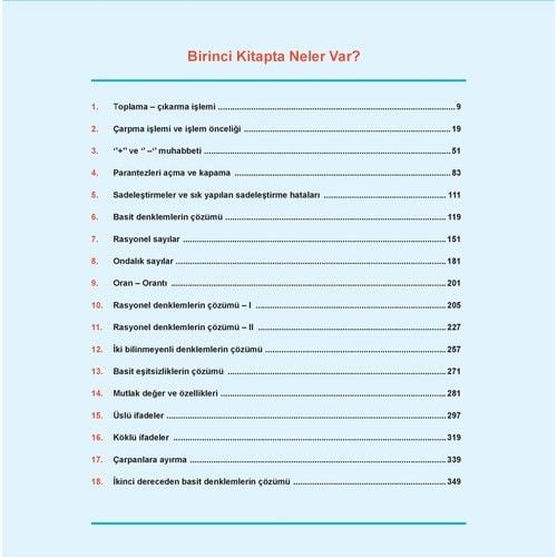 Temel konularla başlayan kitapta matematiğe yeni başlayan ve sınav maratonuna hazırlanmak isteyen öğrencilere uygun bir alt yapı sunuluyor. Toplama ve çıkarma gibi basit işlemlerle öğrencilerin matematik temelini oluşturması sağlanırken adım adım ilerleyen konular eşliğinde matematik için gerekli bilgilerin öğretilmesi amaçlanıyor. Çarpma işlemi ve işlem önceliği ile ilerleyen konular parantez açma ve sadeleştirme gibi kavramlarla devam ediyor. Kitapta öğrencilerin sık yaptığı sadeleştirme hatalarına yer verilerek bu konudaki yanlışların azaltılması hedefleniyor. Basit denklemler, rasyonel ve ondalık sayılarda öğrencilerin daha kapsamlı bilgilerle donatılması gerekiyor. Bu konularda açıklayıcı bilgilere sahip olan kitap sorular ve testlerle zengin bir içerik sunuyor. Oran-orantı konuları ve rasyonel denklemlerin çözümü titiz bir şekilde ele alınırken sınav soruları ile öğrencilerin klasik soru türleri ile karşılaşmaları sağlanıyor. Basit eşitsizliklerin çözümü, mutlak değerler ve öncelikleri, üslü ve köklü ifadeler, çarpanlara ayırma ve ikinci dereceden basit denklemlerin çözümü gibi tüm problemlerde kullanılan matematik bilgileri öğrencilerin tam donanımlı hale gelmesini sağlıyor.