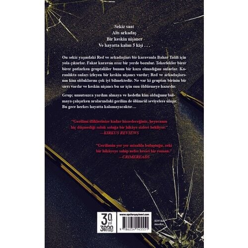 Sekiz Saat Altı Arkadaş Bir Keskin Nişancı Ve Hayatta Kalan 5 Kişi. . . On Sekiz Yaşındaki Red Ve Arkadaşları Bir Karavanla Bahar Tatili İçin Yola Çıkarlar. Fakat Karavan Issız Bir Yerde Bozulur. Tekerlekler Birer Birer Patlarken Gruptakiler Bunun Bir Kaza Olmadığını Anlarlar. Karanlıkta Onları İzleyen Bir Keskin Nişancı Vardır; Red Ve Arkadaşlarının Kim Olduklarını Çok İyi Bilmektedir. Ne Var Ki Gruptan Birinin Bir Sırrı Vardır Ve Keskin Nişancı Bu Sır İçin Onu Öldürmeye Hazırdır. Grup; Umutsuzca Yardım Almaya Ve Hedefin Kim Olduğunu Bulmaya Çalışırken Aralarındaki Gerilim De Ölümcül Seviyelere Ulaşır. Bu Gece Herkes Hayatta Kalamayacaktır… “Gerilimi İliklerinize Kadar Hissedeceğiniz, Heyecanın Hiç Düşmediği Soluk Soluğa Bir Hikâye Sizleri Bekliyor.” —Kırkus Revıews “Gerilimin Yer Yer Mizahla Buluştuğu, Zeki Bir Hikâyeye Sahip Nefes Kesici Bir Roman.” —Crımereads