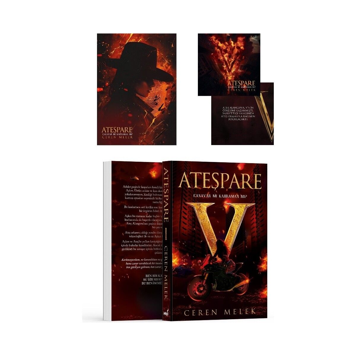 ATEŞPARE - CANAVAR MI KAHRAMAN MI? Kibrim, benim cesaretim. Hırsım, yaşama sebebim. Zekâm, silahım. Adalet peşinde koşarken kendi kimliğini kaybeden bir seri katil: Aşkın. Üstün zekâsı ve kan dondurucu oyunlarıyla yıllardır yakalanamayan, kimliği bulunamayan, tüm dünyanın aradığı, kurnaz oyunları sayesinde herkesin onu erkek sandığı Aşkın, namıdiğer V. Bu korkutucu seri katilin son kurbanıysa Cebonayan adlı gizli bir örgütün lideri Ateş Alanguva’dır. Aşkın bu zamana kadar hiçbir işinde başarısız olmamıştır, bu kurbanında da başarılı olacağını düşünür ve kibrine yenilerek Ateş Alanguva’nın peşine düşer. Ancak Aşkın’ın bilmediği bir şey vardır. Ateş arkasına aldığı yeraltı dünyası ve dünyayı dize getirecek teknolojileri ile en az Aşkın kadar zeki ve tehlikelidir. Aşkın ve Ateş’in yolları kesiştiğinde, önlenemez bir güç savaşının içinde bulurlar kendilerini. Ancak ikisinin de hesaba katmadığı şey, girdikleri bu savaşın içinde birbirlerine duydukları karşı konulmaz çekimdir. Korkmuyordum, ne karanlıktan ne gürleyen gök gürültüsünden ne de bana zarar verebilecek bir insandan. Çünkü ben karanlıktım, ben gürleyen göktüm; ben zarar görmez, ben zarar verirdim. BEN BİR KATİLDİM. BU BİR SIFAT DEĞİLDİ. BU BENİM MESLEĞİMDİ.