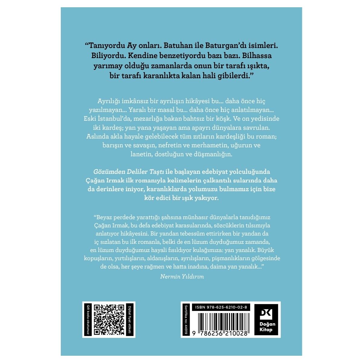 “Tanıyordu Ay onları. Batuhan ile Baturgan’dı isimleri. Biliyordu. Kendine benzetiyordu bazı bazı. Bilhassa yarımay olduğu zamanlarda onun bir tarafı ışıkta, bir tarafı karanlıkta kalan hali gibilerdi.” Ayrılığı imkânsız bir ayrılışın hikâyesi bu... daha önce hiç yazılmayan... Yaralı bir masal bu… daha önce hiç anlatılmayan… Eski İstanbul’da, mezarlığa bakan bahtsız bir köşk. Ve on yedisinde iki kardeş; yan yana yaşayan ama apayrı dünyalara savrulan. Aslında akla hayale gelebilecek tüm zıtların kardeşliği bu roman; barışın ve savaşın, nefretin ve merhametin, uğurun ve lanetin, dostluğun ve düşmanlığın. Gözümden Deliler Taştı ile başlayan edebiyat yolculuğunda Çağan Irmak ilk romanıyla kelimelerin çalkantılı sularında daha da derinlere iniyor, karanlıklarda yolumuzu bulmamız için bize kör edici bir ışık yakıyor. “Beyaz perdede yarattığı şahsına münhasır dünyalarla tanıdığımız Çağan Irmak, bu defa edebiyat karasularında, sözcüklerin tılsımıyla anlatıyor hikâyesini. Bir yandan tebessüm ettirirken bir yandan da iç sızlatan bu ilk romanla, belki de en lüzum duyduğumuz zamanda, en lüzum duyduğumuz hayali fısıldıyor kulağımıza: yan yanalık. Büyük kopuşların, yırtılışların, aldanışların, ayrılışların, pişmanlıkların gölgesinde de olsa, her şeye rağmen ve hatta inadına, daima yan yanalık…” Nermin Yıldırım YAZAR HAKKINDA Çağan Irmak İzmir’in Seferihisar ilçesinde doğdu. Ege Üniversitesi İletişim Fakültesi’nin Radyo Televizyon ve Sinema bölümünden mezun oldu. Denizi, ağaçları, sinemayı, müziği ve edebiyatı çok sevdi. Şimdiye kadar birçok senaryo yazıp filme çekti. 2023 yılında yayımlanan Gözümden Deliler Taştı yazarın ilk öykü kitabıdır.