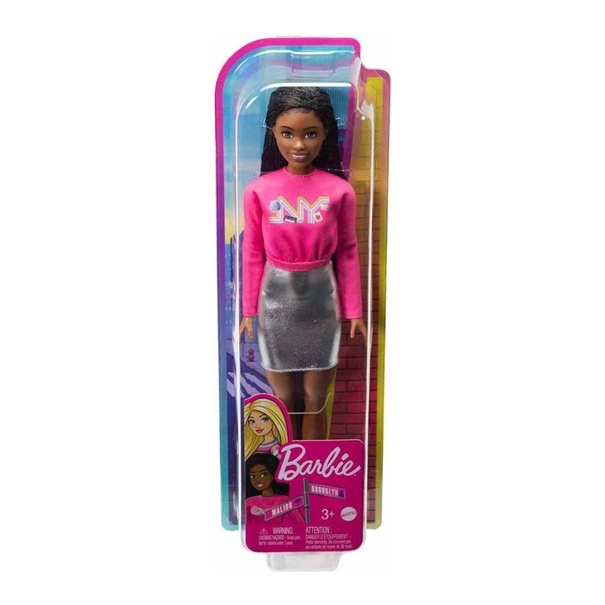 Barbie It Takes Two'dan ilham alan bebekler ve oyun setleriyle, Barbie ve arkadaşlarına bir sonraki büyük maceralarında eşlik edin. Barbie "Brooklyn" Roberts, NYC grafikli pembe tişörtü ve metalik gümüş tonlarındaki son moda eteğiyle tıpkı ekrandaki karakteri gibi görünür. Beyaz spor ayakkabıları, şirin günlük stilini tamamlar.