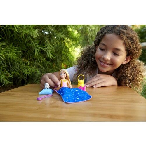 Dış mekanların keyfini çıkarın! Chelsea ile birlikte kamp yaparak eğlenin. Bu oyun seti, Chelsea ve sevimli hayvan arkadaşı baykuşla gece gündüz kamp yapmak isteyen çocukların ihtiyaç duyacağı her şeyi içerir. Chelsea , hayvan arkadaşı, dürbün ve bebeğin boynunda taşıyabildiği pusulayla keşif dolu bir gün geçirin. Macera dolu bir günden sonra bebeği yıldız baskılı uyku tulumuna koyup yastığı ve feneriyle rahat etmesini sağlayın. Bu oyun seti, 3-7 yaş çocuklara kamp maceralarıyla ilgili sınırsız hayaller kurmaları için ilham verir. Bebek tek başına ayakta duramaz. Renkler ve süslemeler çeşitlilik gösterebilir.