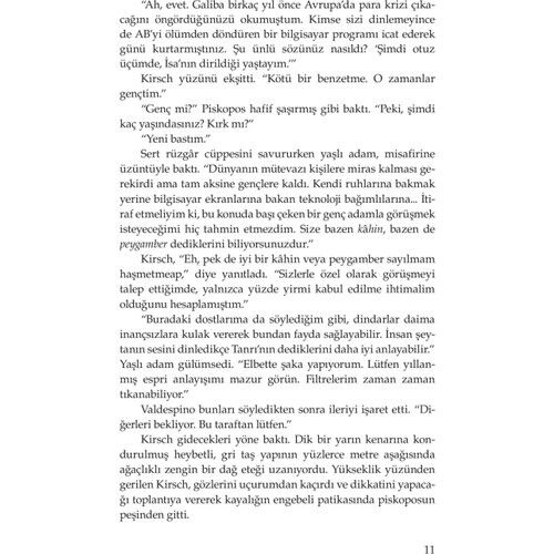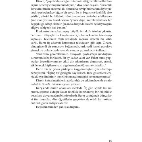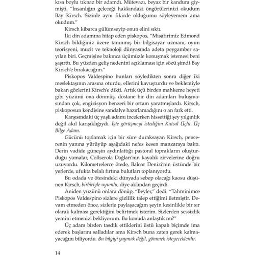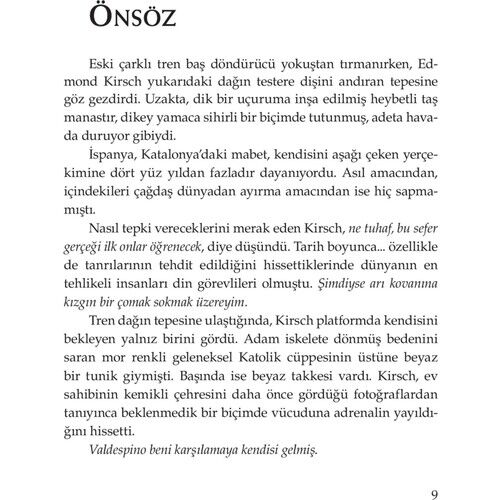 Piskopos, haham ve ulema birbirlerine baktılar, sıkılmış görünüyorlardı. Piskopos, “İlginç bir girizgâh Bay Kirsch. Bize gösterecekleriniz dünya dinlerinin temelini sarsacakmış gibi konuşuyorsunuz," dedi. Genç adam kutsal metinlerin saklandığı bu eski mahzende etrafına baktı. Temellerini sarsmayacak, yıkacak, diye düşündü. Din adamları üç gün içinde bu sunumu bir etkinlikle insanlara duyuracağını bilmiyorlardı. Bunu yaptığında tüm insanlar, dini öğretilerin gerçekten de ortak bir noktası bulunduğunu anlayacaklardı: Hepsinin tümden yanlış olduğunu...