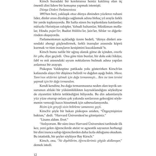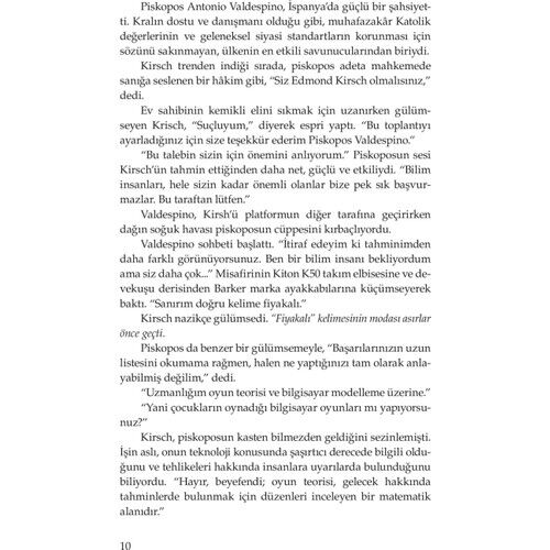 Genç adam, aniden üç büyük dinin temsilcilerine döndü. “Şaşırtıcı bulacağınızı tahmin ettiğim bilimsel bir buluşum sebebiyle bugün buradayım. İnsanlık deneyimimizin en temel iki sorusuna cevap bulma ümidi ile yıllardır peşinden koşuyordum. Bu bilginin tüm inananları derinden etkileyeceğine inanıyorum. Nasıl desem, ‘yıkıcı’ diye tanımlanabilecek bir değişikliğe sebep olabilir. Birazdan görecekleriniz, dünyayla paylaşmayı umduğum sunumun kaba bir kesiti. Fakat bunu yapmadan önce dünyanın en etkili din adamlarına danışmak, en çok etkilenecek kişilerce nasıl algılanacağını öğrenmek istedim.”