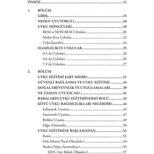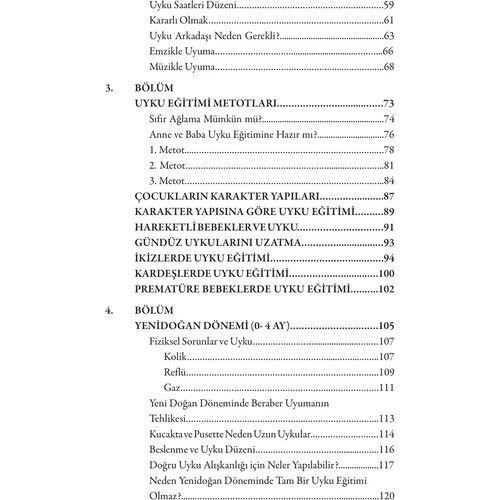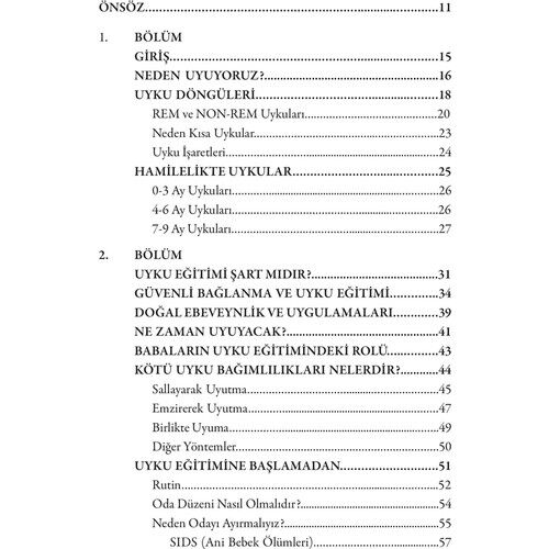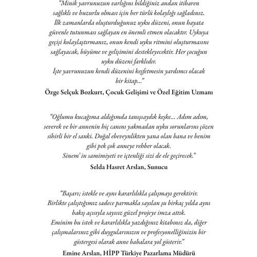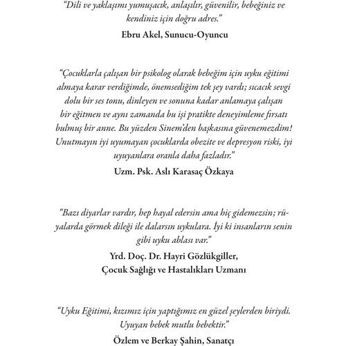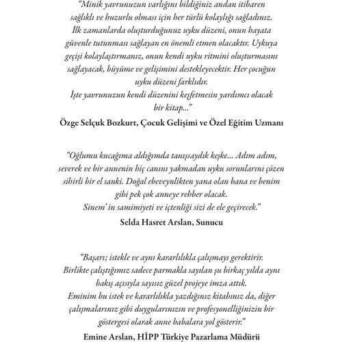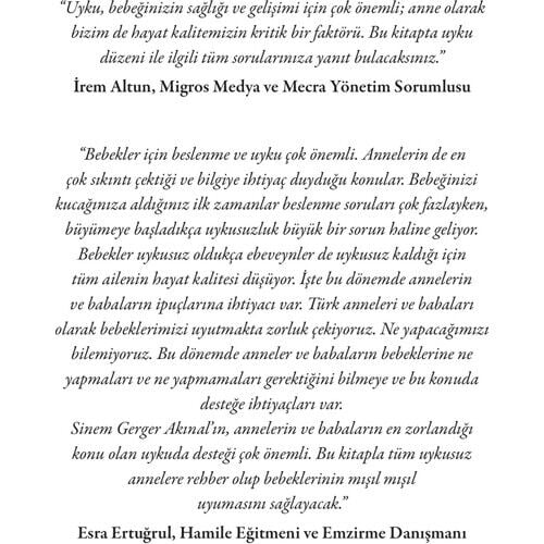 -tTam kendinizi sıcacık yatağınıza bıraktınız yine bir ağlama sesi… Karnı tok, gazı yok. Altı temiz, pişik yok. Kucakta pışpış, ayakta salla, yatağına yatır, kaldır, yine yatır. Olmadı odada gezdir. En sevdiği oyuncağı eline tutuştur, pencereden baktır. Her gece saatlerce çırpın ve sonunda pes et.-tHer yöntemi denemenize rağmen sonuç huzursuz, mutsuz bir bebek ve zombiye dönüşmüş bir anne mi? Bunu tersine çevirmek ve kesintisiz gece uykularına sahip olmak mümkün.-tUyku danışmanı Sinem Gerger Akınal’la uykuyla ilgili tüm kafa karıştırıcı sorular rafa kalkıyor. Bebekten bebeğe, anneden anneye değişen yöntemlerle, sınırlarınızı zorlamadan ve sinirlerinizi yıpratmadan sizi rahatlatacak ve bilinçlendirecek bir kitapla tanışmaya hazır olun. Bir de cin gibi etrafa bakan o minik gözlerin bir anda kapanıp bebeğinizin dinlendirici bir uykuya dalmasının size yaşatacağı huzura!-tSayfa Sayısı: 216 Sayfa-tYazar: Sinem Gerger Akınal