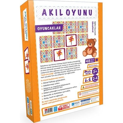 HAFIZA OYUNU48 Parça - Sert Mukavva SıvamaKutu: 19x27,5x6,5cm Kartlar: 7x7cmAKIL OYUNU“hafıza geliştiren eşleştirme kartları”Hafıza oyunlarının hafızayı büyük ölçüde artırabilirliği bilimsel olarak kanıtlanmıştır. Amaç en az karta dokunarak, en kısa zamanda oyundaki tüm kartları eşleştirmektir.Bu mükemmel zihin eğitmeni size ve çocuğunuza faydalı bir “”beyin jimnastiği”” etkinliği olacaktır. Hafıza kartı oyunu hem çocuklar hem de yetişkinler için eğlencelidir.En önemli faydalarından bazıları;- Görsel hafızayı güçlendiririr.- Odaklanmayı arttırır.- Zekanın ve mantıksal düşünmenin gelişmesine yardımcı olur.- Dikkat yeteneğini ve konsantrasyonu arttırır.- Benzerlik ve farklılıkları ayırt ettirir.- Kolay basit ve eğlenceli.Bu oyun sayesinde çocuğunuzla kaliteli vakit geçirebilirsiniz.