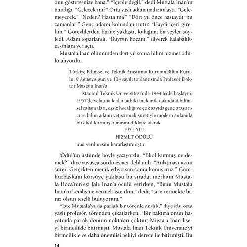 Ülkemizde pek benimsenmemiş bir dalda, biyografik roman türünde, Oğuz Atay’ın, kendine özgü üslubu ve kurgusuyla, kendi hocası da olan Mustafa İnan’ı anlatışı. Bir halk çocuğunun uluslararası ün sahibi bilim adamı oluşunun zorlu serüveni sergilenirken toplumsal eleştiri kalıplarının da zorlanışı. İnan’ın yaşamından kesitler veren fotoğraf albümüyle birlikte.