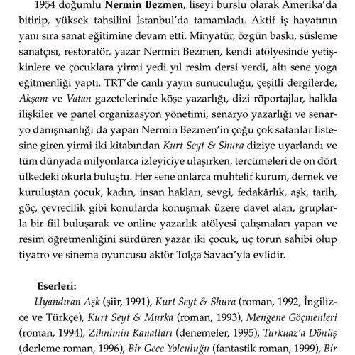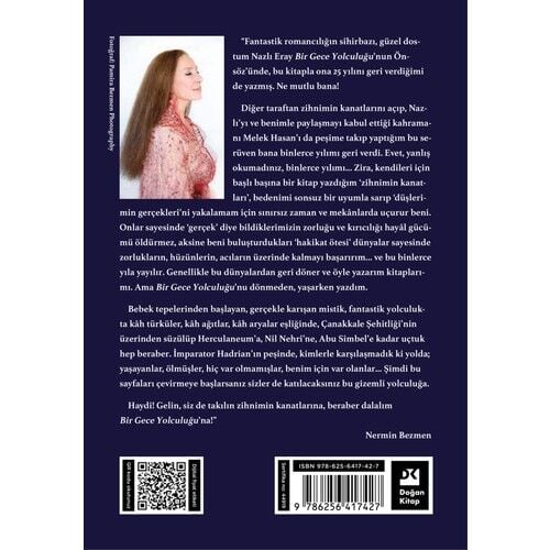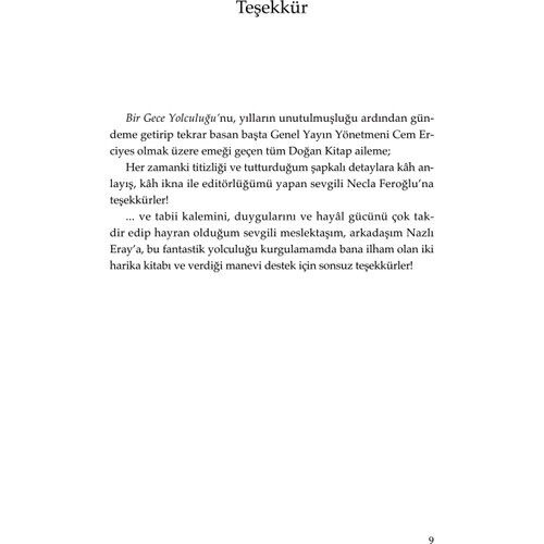 Diğer taraftan zihnimin kanatlarını açıp, Nazlı’yı ve benimle paylaşmayı kabul ettiği kahramanı Melek Hasan’ı da peşime takıp yaptığım bu serüven bana binlerce yılımı geri verdi. Evet, yanlış okumadınız, binlerce yılımı... Zira, kendileri için başlı başına bir kitap yazdığım ‘zihnimin kanatları’, bedenimi sonsuz bir uyumla sarıp ‘düşlerimin gerçekleri’ni yakalamam için sınırsız zaman ve mekânlarda uçurur beni. Onlar sayesinde ‘gerçek’ diye bildiklerimizin zorluğu ve kırıcılığı hayâl gücümü öldürmez, aksine beni buluşturdukları ‘hakikat ötesi’ dünyalar sayesinde zorlukların, hüzünlerin, acıların üzerinde kalmayı başarırım... ve bu binlerce yıla yayılır. Genellikle bu dünyalardan geri döner ve öyle yazarım kitaplarımı. Ama Bir Gece Yolculuğu’nu dönmeden, yaşarken yazdım.