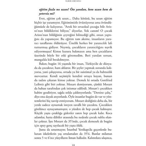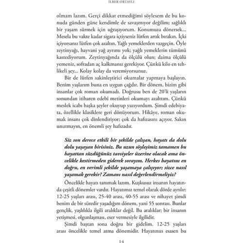 Yenal Bilgici'nin tarih profesörü İlber Ortaylı ile yaptığı söyleşi, birçok sorunun cevabını içinde barındırıyor. "Bir ömrü hakkıyla yaşamak için ne lazımdır?", "İnsan kimden, ne öğrenir?", "En iyi nasıl seyahat edilir; bir şehir nasıl dolaşılır?", "Hangi müze, hangi meydan, hangi sokakları görmek için dünyanın bir ucuna kadar gidilebilir?", "En verimli sonucu alabilmek için nasıl çalışmak gerekir?" gibi sorular ve bunlardan daha fazlasına cevap vererek, 7'den 70'e herkese tavsiyelerde bulunan İlber Ortaylı, kullandığı ifadeler ve sunduğu öneriler ile herkese yol gösteriyor. Akıcı bir sohbet havasında ilerleyen kiitap, bir çırpıda okunuveriyor.