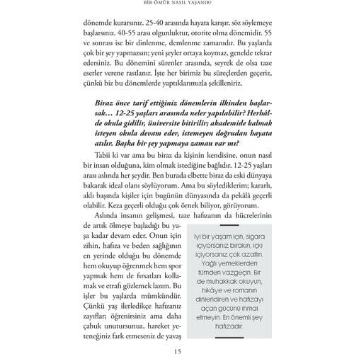 DAHA ANLAMLI YAŞAMAK İÇİN İLBER ORTAYLI’DAN TAVSİYELER… “Cesur olun. Kendinizi rahat hissettiğiniz alanın dışında pencereler açın. Farklı dünyalarla ancak böyle tanışırsınız. Ben hep yerimde dursaydım, dünyamı değiştirecek insanları aramasaydım, bugün tanıdığınız ben olmazdım. Bir insanın bittiği an, miskinliğe esir olduğu andır. İnsan, konforundan vazgeçmeyi göze almalıdır. Kendi dünyasını yerinden kendisi oynatmalıdır.” İlber Ortaylı İlber Ortaylı, yediden yetmişe herkesin faydalanacağı, bilge şahsiyetinden ve yaşam tecrübesinden süzülen tavsiyelerden oluşan bir eserle karşımızda. İlber Hoca bu kitapta, bir insanın, çocukluktan itibaren hayatın hemen her alanında ihtiyaç duyacağı çözümleri nasıl bulabileceğini örnekler vererek anlatıyor. “Herkes kendi talihinin mimarıdır” sözünü hatırlatarak, kendi yolunu çizmenin ne anlama geldiğini tüm kritik noktalarıyla yorumluyor. - Bir ömrü hakkıyla yaşayabilmek ve yaşanan her andan tat alabilmek için önce ne lazımdır? - İnsan hayatı kaç dönemden oluşur ve her bir dönemde neleri tecrübe etmek gerekir? 15, 25, 40 ve 55 yaşları neden birer eşiktir? - İnsan kimden, ne öğrenebilir? Kendi kendini yetiştirmek nasıl mümkün olur? - Kişi mesleğini neye göre seçmelidir? - Bir işin uzmanı olmak ve o uzmanlık bilgisiyle çalışmak için nelere ihtiyaç vardır? - Bir dil, en iyi nasıl ve ne zaman öğrenilir? - En verimli sonucu alabilmek için nasıl çalışmak gerekir? - Sorumluluk sahibi bir insan, kendisi veya çocukları için nasıl bir eğitim modeli aramalıdır? - Hayata değer katmak için ne tür insanları arayıp bulmak gerekir? - Doğru kararları alabilmek için en çok kimleri dinlemek gerekir? - En iyi nasıl seyahat edilir; bir şehir nasıl dolaşılır? Hangi müze, hangi meydan, hangi sokakları görmek için dünyanın bir ucuna kadar gidilebilir? - İyi film, güzel müzik, doğru kitap nedir? Hangi temel eserleri dinlemeli, okumalı ve seyretmeliyiz? - İnsan yaşadığı şehirden tam manasıyla nasıl yararlanabilir? “Bir Ömür Nasıl Yaşanır?”, ülkemizin medarıiftiharı olmuş bir tarihçinin gözünden, insanın hayattaki anlam arayışına, bu arayışın tadını nasıl çıkaracağına ve süreç boyunca karşılaşacağı zorluklarla nasıl baş etmesi gerektiğine dair çok özel bir kılavuz…