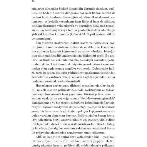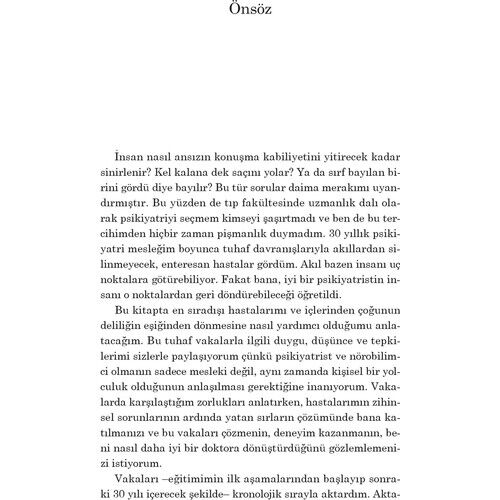 Bu kitap bir psikiyatristin zihnine ve onun giderek gelişim gösteren mesleki yaşamına yapılan aydınlatıcı bir yolculuk. Aynı zamanda bu branşın ve daha önce görülmemiş, tanısı koyulmamış çeşitli akıl hastalıklarının perde arkasına da bir bakış… Kitabı okurken kendinizi, bizi insan yapan şaşırtıcı tuhaflıklar üstüne düşünürken bulacaksınız.