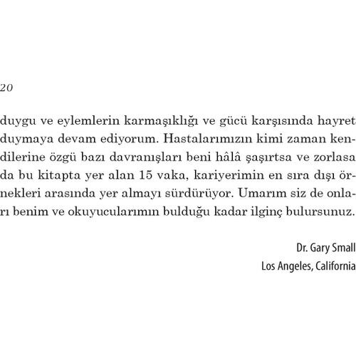 Gerçek hikâyeler kurgudan çok daha tuhaftır, Dr. Gary Small da bunu gayet iyi biliyor. Psikiyatriyle ve insan beyni üstüne çığır açıcı araştırmalarla geçen otuz yıl içinde Dr. Small pek çok şey görmüş. Şimdi ofisinin kapılarını açmaya ve kariyerinin en gizemli, ilginç ve tuhaf hastalarını anlatmaya hazır.