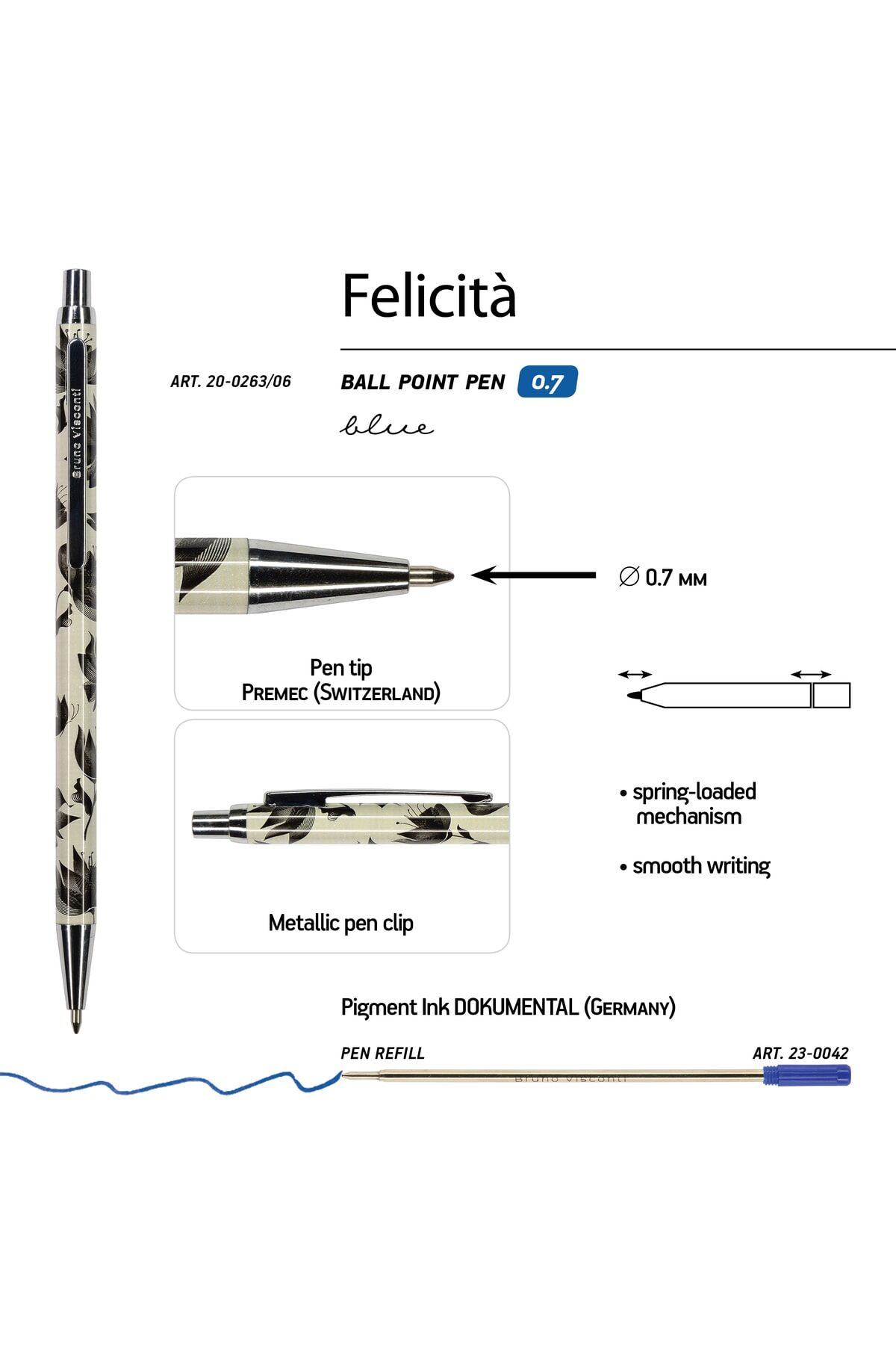 Marka: Bruno Visconti. Mürekkep rengi: Mavi. Mürekkep türü: Alman mürekkebi. Kalem ucu: 0.7mm. Gövde malzemesi: Metal gövde. Kutulu
