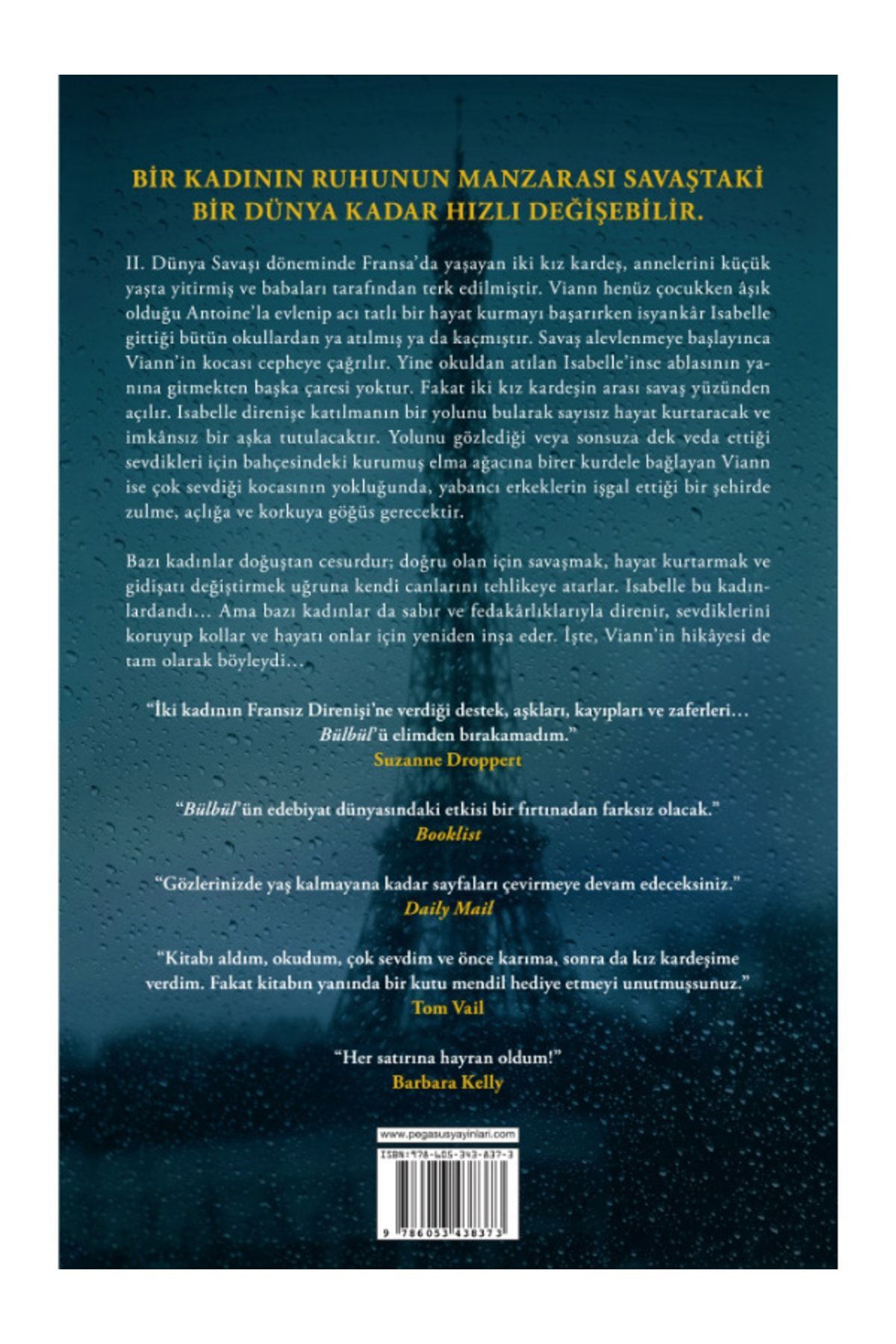 Bülbül Kristin Hannah / Pegasus Basım Yılı: 2017; Baskı: 1; Sayfa Sayısı: 544; Kağıt Türü: 2. Hamur; Ebat: 13,5 x 21; Orijinal Dili: İngilizce; Cilt Durumu: Karton Kapak; ISBN: 9786053438373; Yazar: Kristin Hannah; Bir Kadının Ruhunun Manzarası Savaştaki Bir Dünya Kadar Hızlı Değişebilir. II. Dünya Savaşı döneminde Fransa'da yaşayan iki kız kardeş annelerini küçük yaşta yitirmiş ve babaları tarafından terk edilmiştir. Viann henüz çocukken âşık olduğu Antoine'la evlenip acı tatlı bir hayat kurmayı başarırken isyankâr Isabelle gittiği bütün okullardan ya atılmış ya da kaçmıştır. Savaş alevlenmeye başlayınca Viann'in kocası cepheye çağrılır. Yine okuldan atılan Isabelle'inse ablasının yanına gitmekten başka çaresi yoktur. Fakat iki kız kardeşin arası savaş yüzünden açılır. Isabelle direnişe katılmanın bir yolunu bularak sayısız hayat kurtaracak ve imkânsız bir aşka tutulacaktır. Yolunu gözlediği veya sonsuza dek veda ettiği sevdikleri için bahçesindeki kurumuş elma ağacına birer kurdele bağlayan Viann ise çok sevdiği kocasının yokluğunda yabancı erkeklerin işgal ettiği bir şehirde zulme açlığa ve korkuya göğüs gerecektir. Bazı kadınlar doğuştan cesurdur; doğru olan için savaşmak hayat kurtarmak ve gidişatı değiştirmek uğruna kendi canlarını tehlikeye atarlar. Isabelle bu kadınlardandı... Ama bazı kadınlar da sabır ve fedakârlıklarıyla direnir sevdiklerini koruyup kollar ve hayatı onlar için yeniden inşa eder. İşte Viann'in hikâyesi de tam olarak böyleydi... "İki kadının Fransız Direnişi'ne verdiği destek aşkları kayıpları ve zaferleri... Bülbül'ü elimden bırakamadım." -Suzanne Droppert- "Bülbül'ün edebiyat dünyasındaki etkisi bir fırtınadan farksız olacak." -Booklist- "Gözlerinizde yaş kalmayana kadar sayfaları çevirmeye devam edeceksiniz." -Daily Mail- "Kitabı aldım okudum çok sevdim ve önce karıma sonra da kız kardeşime verdim. Fakat kitabın yanında bir kutu mendil hediye etmeyi unutmuşsunuz." -Tom Vail- "Her satırına hayran oldum!" -Barbara Kelly- "Bülbül gerçekten nefes kesiciydi! Bu kitabı okuyun. Zor zamanlarda doğru olanı yaptıklarına inanan iki genç ve cesur kız kardeşin hikâyesi sizi sürekli şaşırtacak." -Dr. Miriam Klein Kassenoff- "Kardeş sevgisi dostluk ve kayıplar üzerine etkileyici bir roman. Okurken çok gözyaşı dökeceksiniz..." -Look- "Bülbül aile arasında bir kırgınlıkla başlıyor ve Nazilere direnmek için hayatlarını tehlikeye atan sıradan kadınların cesareti ve kahramanlığıyla savaşın korkunç atmosferinde müthiş bir sona doğru ilerliyor. Bir hikâyeden duygusal olarak bu kadar etkilenmeyeli uzun zaman olmuştu." -Marilyn MacIvor- "Daha ilk sayfasından itibaren özümsenip sindirilmeyi hissedilmeyi ve sevgiyle paylaşılmayı hak eden bir roman. İki kız kardeş arasındaki bağ son derece dürüst ve insanın içini sızlatıyor. Büyüleyici ve bir o kadar da hüzünlü..." -Cherise Bailey- "Bülbül'ü bitirdikten sonra gözyaşlarımın dinmesi birkaç saatimi aldı. Gerçekten kusursuzdu." -Jody Robinson- "Gözlerim dolduğu için okuyamadığımdan kitabı en az üç kez elimden bırakmak zorunda kaldım ve bitirince de birazcık hıçkırıklara boğulmuş olabilirim. Tam anlamıyla olağanüstü bir hikâye!" -Kristin Pidgeon-