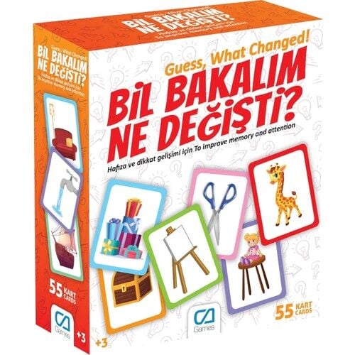 Bil Bakalım Ne Değişti ile çocuklar kartlar arasında hangi kartta hangi görselin değiştiğini bulmaya çalışırlar. İlk başlayan oyuncu 5 kart seçer ve 5 kartın ön yüzüne 10 saniye baktıktan sonra diğer oyuncu asıl oyuncu görmeden 5 karttan birini ters çevirir. Oyuncu ters çevrilen kartın hangisi olduğunu bulmaya çalışır. Bulabilirse kartı kazanır. Oyun sonunda en çok kart sahibi olan oyuncu oyunu kazanır. Çocukların algılanama, karar verme, deneme - yanılma ve başarma duygularının gelişimine katkı sağlar. Çocukların ince motor gelişimine katkı sağlar. Çocukların zihinsel gelişimine katkı sağlar. Yaş Aralığı: 3 yaş ve üzeri Kart Sayısı: 55 Oyuncu Sayısı: 2 oyuncu ve üzeri.