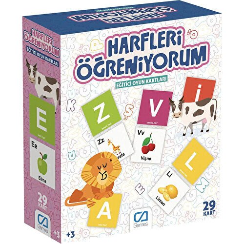 Eğitici Kartlar serisinin Harfleri Öğreniyorum Oyun Kartları ile minikler hem öğrenecek hem de eğlenecekler! 29 karttan oluşan bu eğitici kartlar çocukların harfleri eğlenerek öğrenmesine yardımcı olmaktadır. Çocuklara resimlerle örnek vererek öğrenimi ve akılda kalıcılığı kolaylaştırmaktadır. ; Çocukların; el-göz koordinasyonu, dikkat, parça-bütün ilişkisini kavrama, küçük kas gelişimi, özgüven kazanmalarını ve sosyal yeteneklerinin gelişmesini sağlamaktadır. Aynı zamanda analiz-sentez, sınıflandırma-sıralama ve problem çözme yeteneklerinin gelişmesine yardımcı olmaktadır. ; Kart ölçüsü: 8,3 x 8,3 cm. ; Kutu ölçüsü: 22,5 x 6 x 20 cm. ; Malzeme: 1. Sınıf Mukavva ;