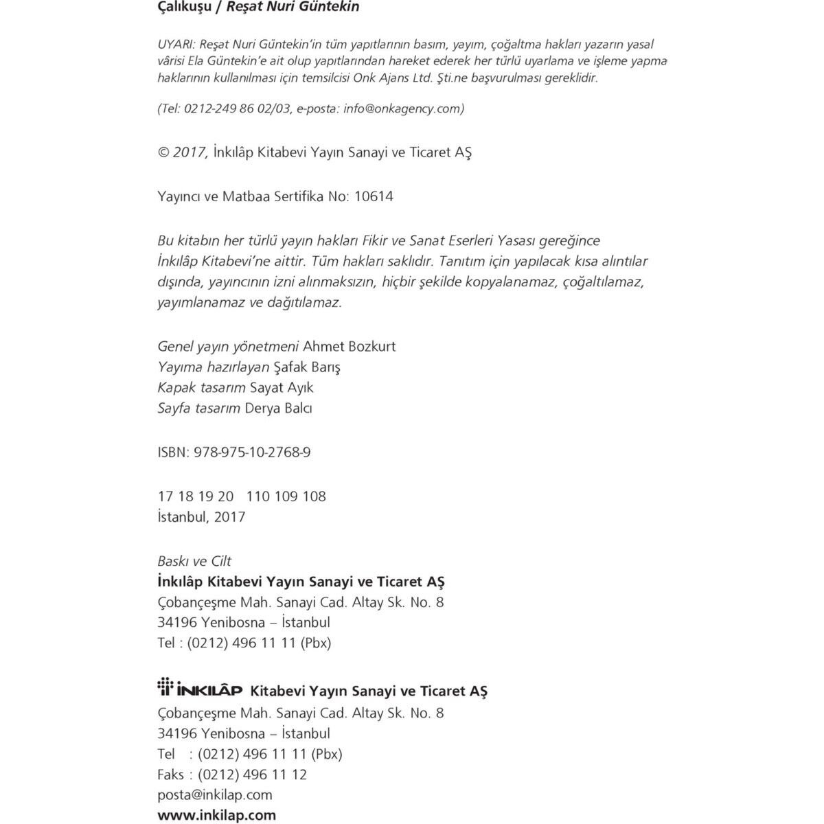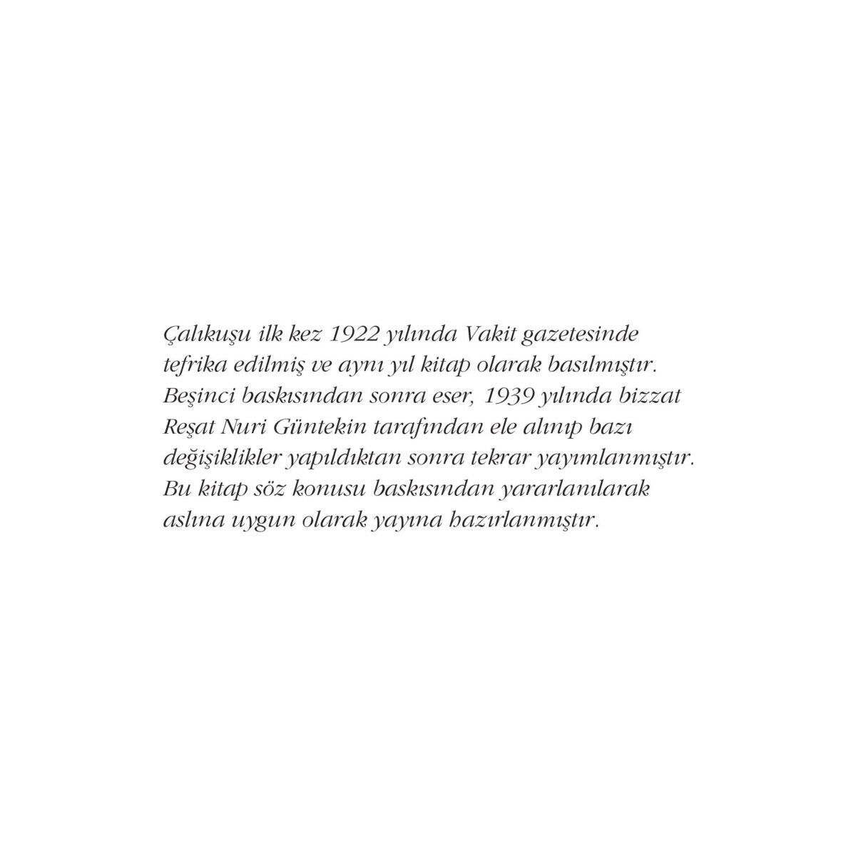 Reşat Nuri Güntekin'in klasiklerinden biri olan Çalıkuşu, İnkılap Kitapevi aracılığıyla okurlarla buluşuyor. 541 sayfa olarak sunulan eser, ilk olarak 1922 yılında Vakit adlı gazete için tefrika edilmiştir. 1922 yılından bu yana farklı yayınevlerinde kitap olarak da basılan Çalıkuşu, aslına uygun olarak yayına hazırlanmıştır. Güntekin'in ününü perçinleyen ve yazarı ölümsüz kılan eserlerden biri olan Çalıkuşu, roman türünde kategorize ediliyor.