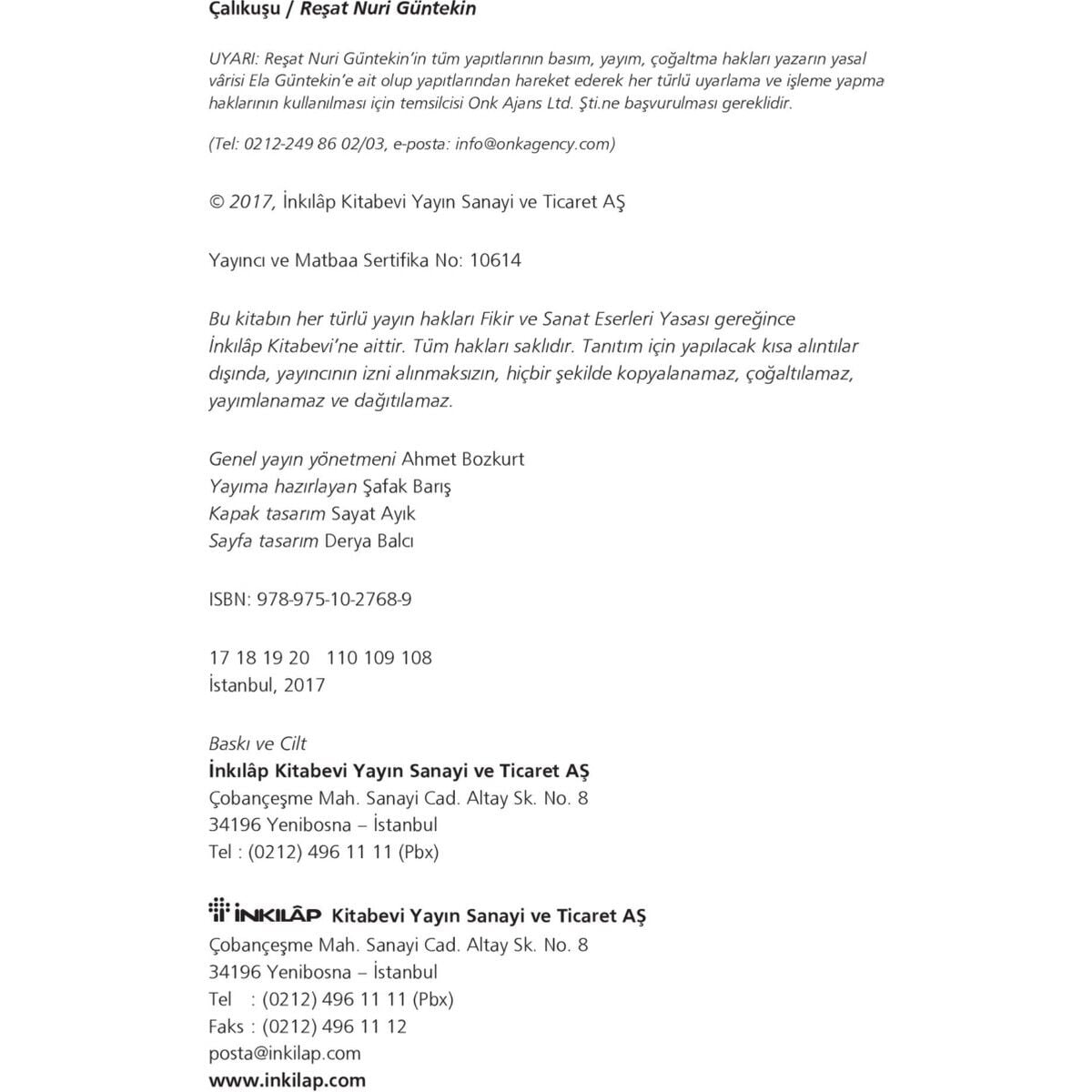 Reşat Nuri Güntekin'in klasiklerinden biri olan Çalıkuşu, İnkılap Kitapevi aracılığıyla okurlarla buluşuyor. 541 sayfa olarak sunulan eser, ilk olarak 1922 yılında Vakit adlı gazete için tefrika edilmiştir. 1922 yılından bu yana farklı yayınevlerinde kitap olarak da basılan Çalıkuşu, aslına uygun olarak yayına hazırlanmıştır. Güntekin'in ününü perçinleyen ve yazarı ölümsüz kılan eserlerden biri olan Çalıkuşu, roman türünde kategorize ediliyor.