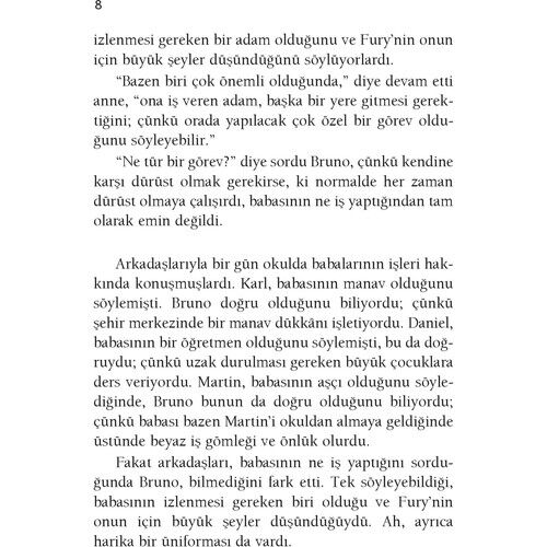 Bu kitabı okumaya başladığınızda, Bruno adında dokuz yaşındaki bir çocukla bir yolculuğa çıkacaksınız (ama bu kitap dokuz yaşındakiler için değil). Ve er geç Bruno ile birlikte bir tel örgüye varacaksınız.