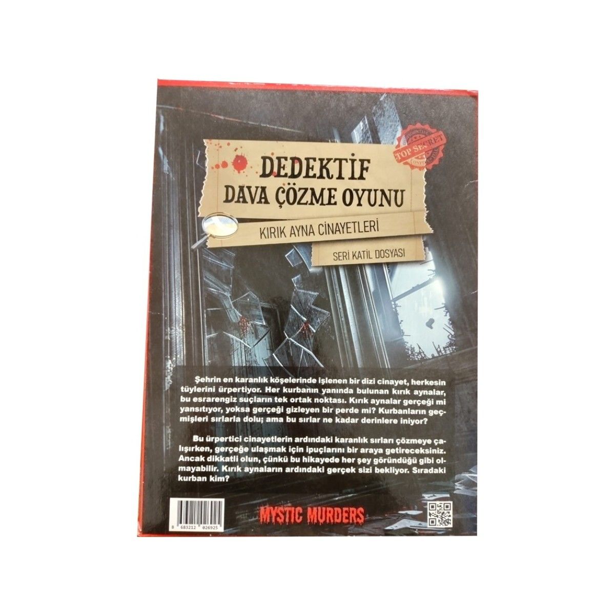 Dedektif Oyunu Mystic Murders Kırık Ayna Cinayetleri Kırık Ayna Cinayetleri Tanık İfadeleri Dijital Deliller Parmak İzi Raporu Cinayet Raporları Banka Ekstresi Şifreli Dökumanlar Şehrin en karanlık köşelerinde işlenen bir dizi cinayet, herkesin tüylerini ürpertiyor. Her kurbanın yanında bulunan kırık aynalar, bu esrarengiz suçların tek ertak noktası. Kırık aynalar gerçeği mi yansıtıyor, yoksa gerçeği gizleyen bir perde mi? Kurbanların geçmişleri sırlarla dolu; ama bu sırlar ne kadar derinlere iniyor? Bu ürpertici cinayetlerin ardındaki karanlık sırları çözmeye çalışırken, gerçeğe ulaşmak için ipuçlarını bir araya getireceksiniz. Ancak dikkatli olun, çünkü bu hikayede her şey göründüğü gibi ol- mayabilir. Kırık aynaların ardındaki gerçek sizi bekliyor. Sıradaki kurban kim? MYSTIC MURDERS Ölçüle: 22cmx30cm Sayfa Sayısı: 16 sayfa, 1 Şifre sayfası