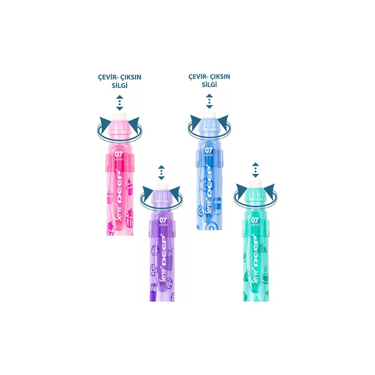 Set içerisinde; Pembe, Mor, Yeşil ve Gök Mavisi olmak üzere toplamda 4 renk Serve Deep Versatil 0.7 Uçlu Kalem bulunmaktadır.