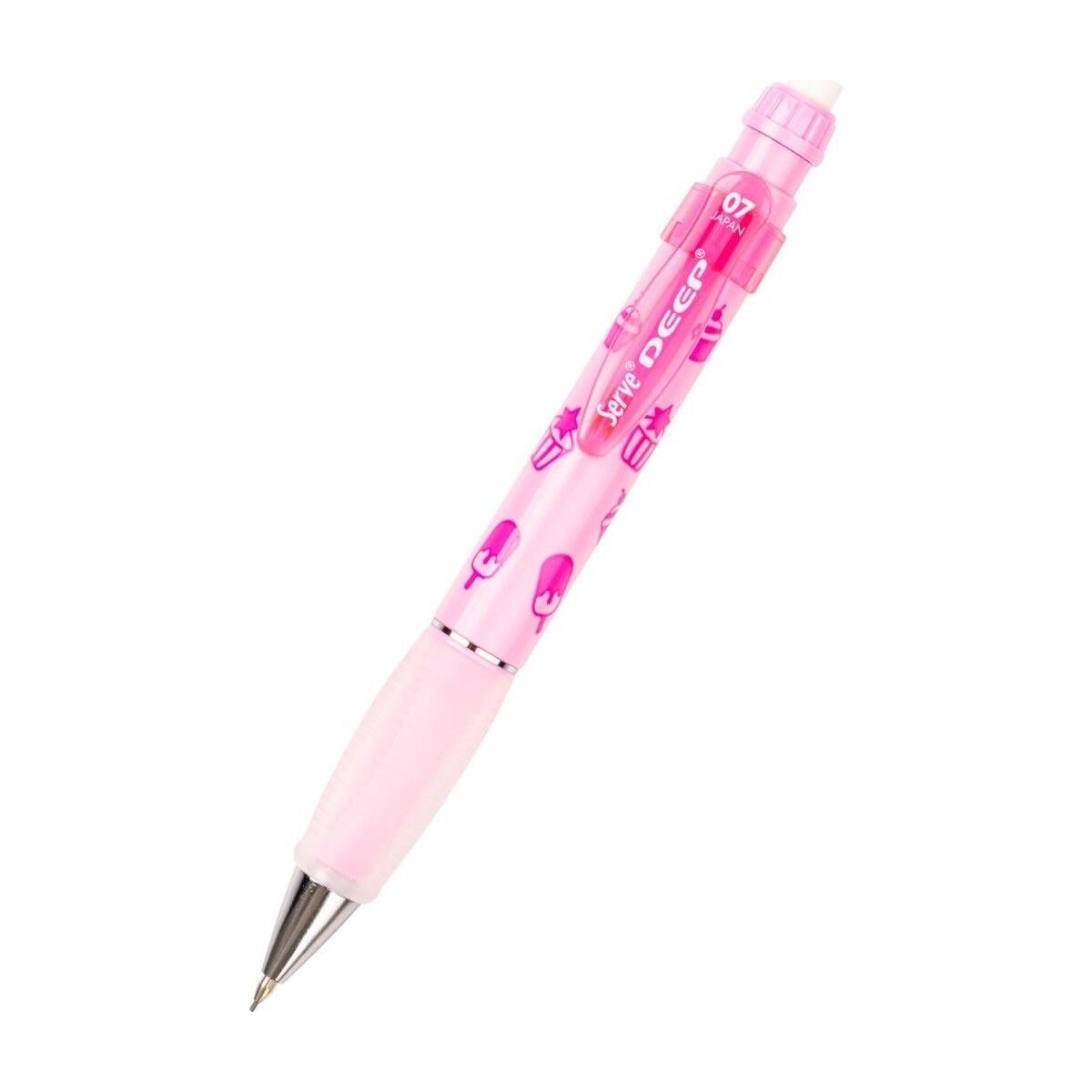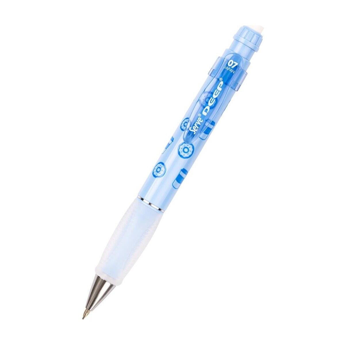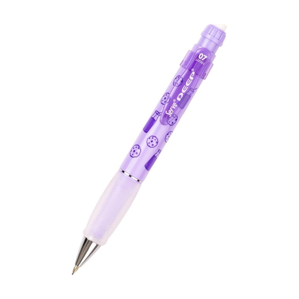 Serve Deep Yeni Tatlı Serisi Her kalemin üzerinde farklı desenler yer almaktadır. Lavanta: Süt & Kurabiye ; Şeker Pembe: Dondurma & Cupcake ; Gök Mavi: Donut &Kahve ; Nane Yeşili: Kahve & Kruvasan ; Geniş gövde tasarımlı, yüksek kaliteli mekanik kurşun kalem ; Kauçuk grip ile rahat kullanım ; Çevirince ortaya çıkan büyük boy kaliteli silgi ; Gizlenebilir metal uç ile güvenli kullanım ; Japonya'da üretilmiştir ; 0.7 mm uç kalınlığında 4 farklı pastel renk seçeneği ; Kaliteli uçlu kalem ; Uzun ömürlü versatil kalem ;