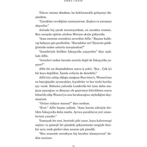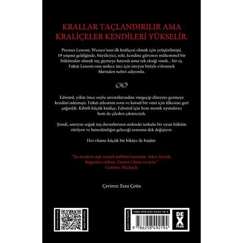 KRALLAR TAÇLANDIRILIR AMA KRALİÇELER KENDİLERİ YÜKSELİR. Prenses Lenora, Wessco’nun ilk kraliçesi olmak için yetiştirilmişti. 19 yaşına geldiğinde, büyüleyici, zeki, kendine güvenen mükemmel bir hükümdar olarak taç giymeye hazırdı ama tek eksiği vardı... bir eş. Fakat Lenora onu sadece tacı için isteyen biriyle evlenmek fikrinden nefret ediyordu. Edward, yıllar önce soylu unvanlarından vazgeçip dünyayı gezmeye kendini adamıştı. Fakat ailesinin zoru ve kutsal bir vaat için ülkesine geri çağırıldı. Kibirli küçük kraliçe, Edward için hem merak uyandırıcı hem de çileden çıkarıcıydı. Şimdi, sarayın soğuk taş duvarlarının ardında tutkulu bir oyun hüküm sürüyor ve hanedanlığın geleceği sonsuza dek değişiyor. Her efsane küçük bir hikâye ile başlar. “Bu modern aşk masalı kalbimi kazandı. Sek si, komik. Bağımlısı oldum. Emma Chase en iyisi.” -Corinne Michaels Çeviren: Esra Çetin