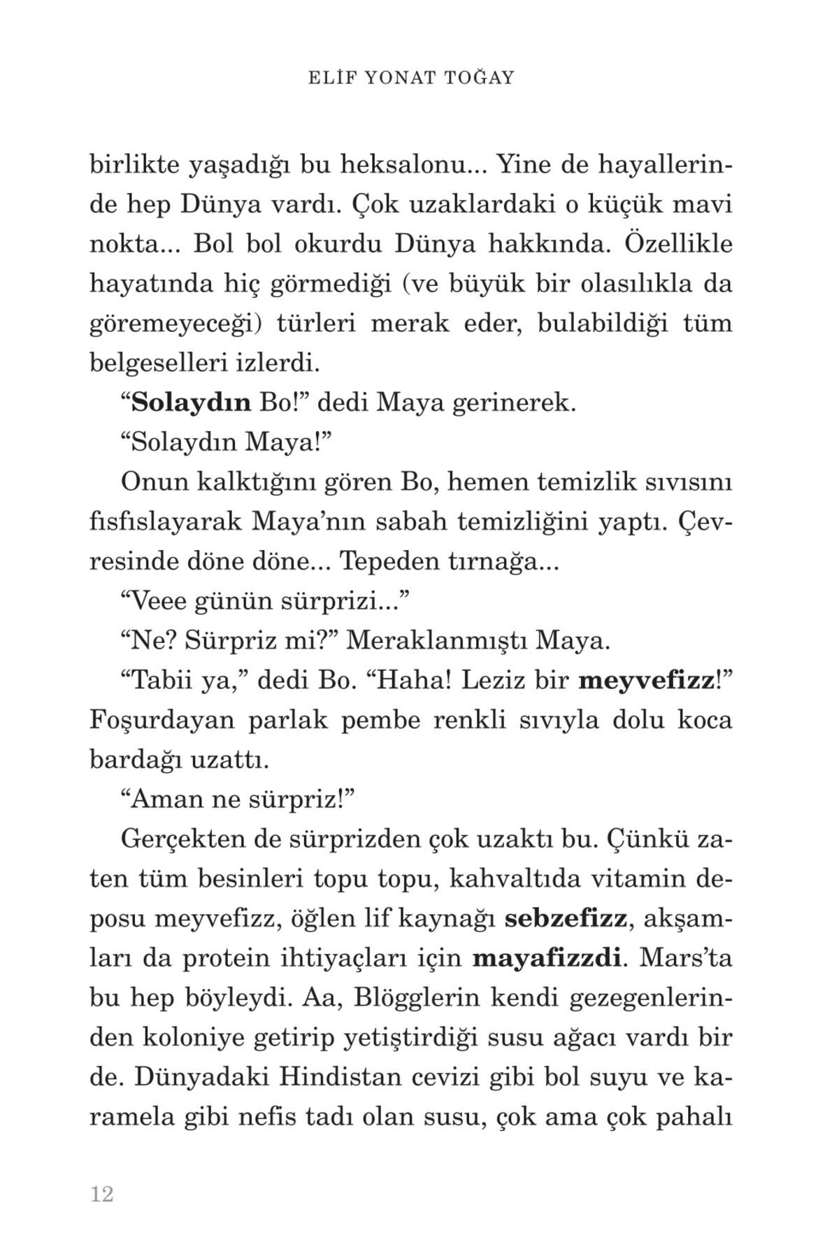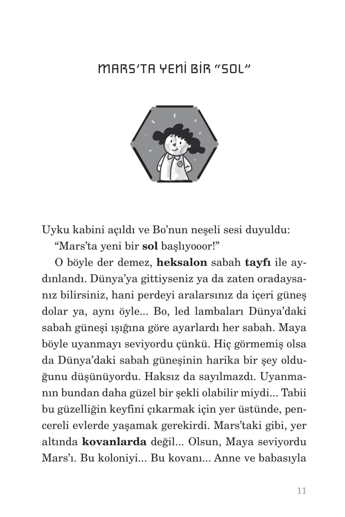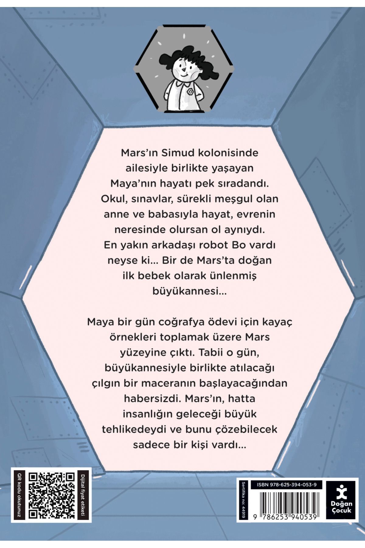 Resimleyen: Doğan Gençsoy Mars'ın Simud kolonisinde ailesiyle birlikte yaşayan Maya'nın hayatı pek sıradandı. Okul, sınavlar, sürekli meşgul olan anne ve babasıyla hayat, evrenin neresinde olursan ol aynıydı. En yakın arkadaşı robot Bo vardı neyse ki… Bir de Mars'ta doğan ilk bebek olarak ünlenmiş büyükannesi… Maya bir gün coğrafya ödevi için kayaç örnekleri toplamak üzere Mars yüzeyine çıktı. Tabii o gün, büyükannesiyle birlikte atılacağı çılgın bir maceranın başlayacağından habersizdi. Mars'ın, hatta insanlığın geleceği büyük tehlikedeydi ve bunu çözebilecek sadece bir kişi vardı…
