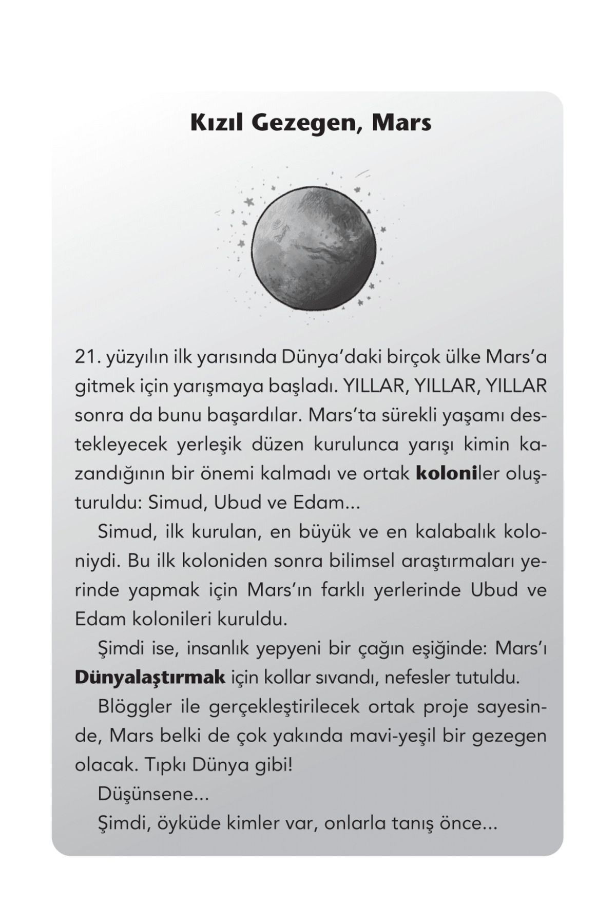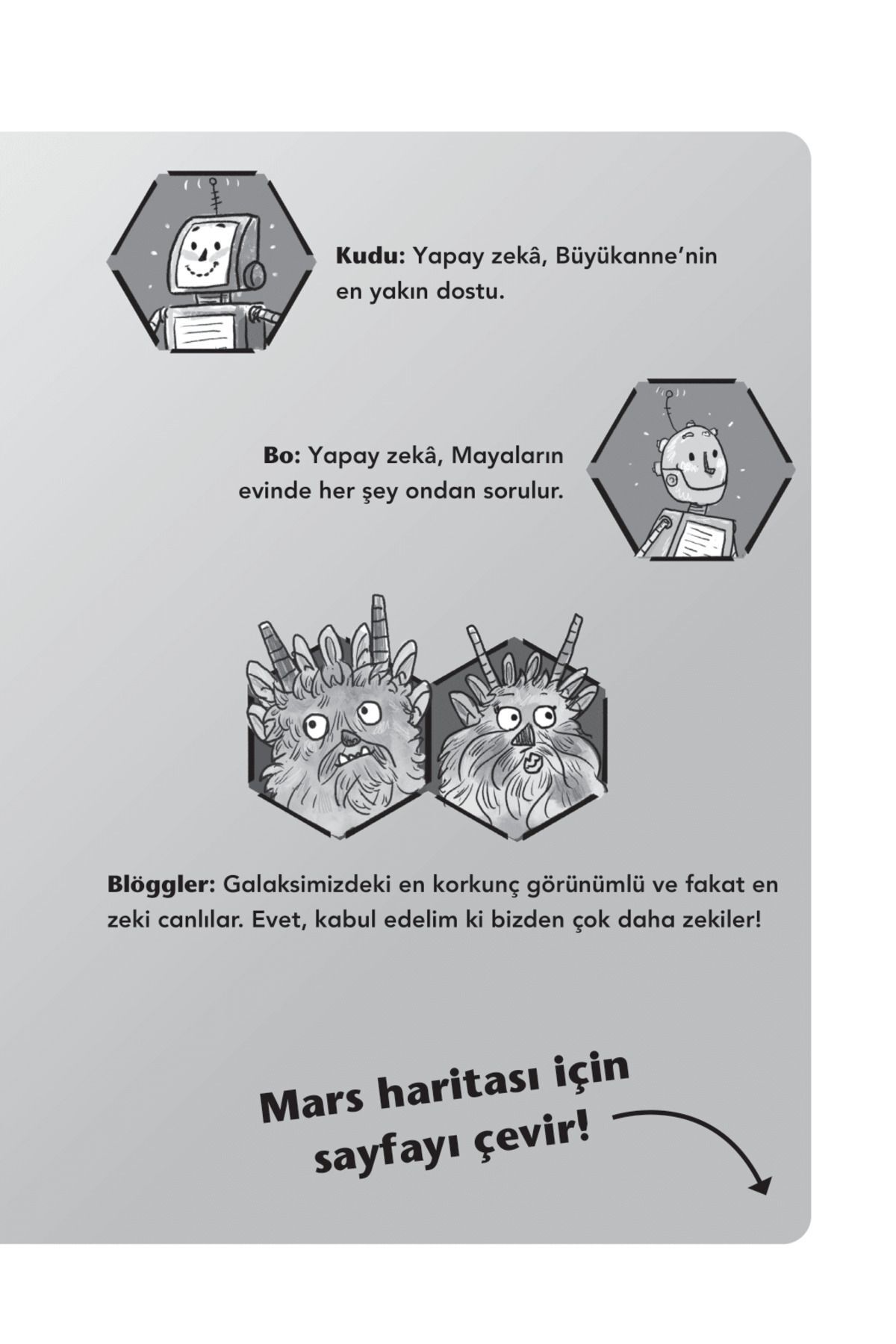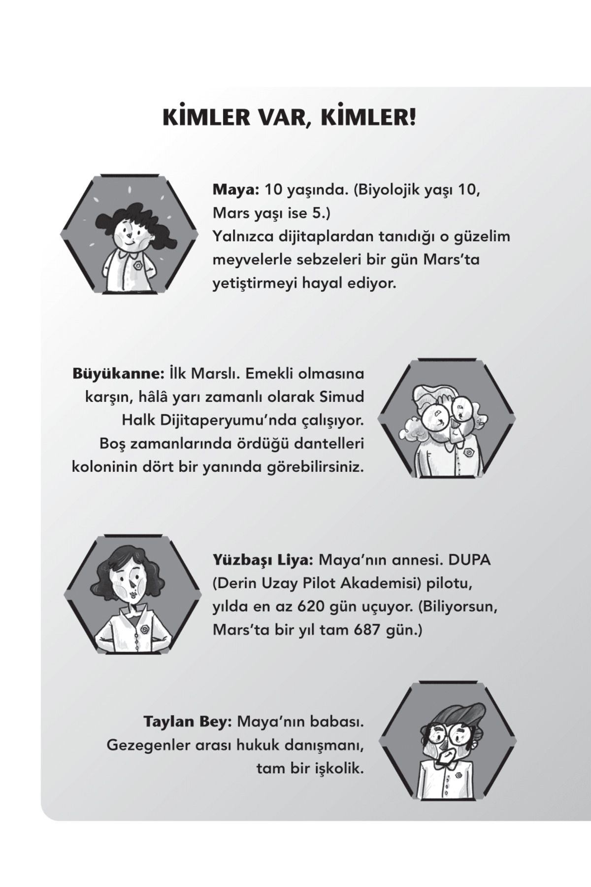 Resimleyen: Doğan Gençsoy Mars'ın Simud kolonisinde ailesiyle birlikte yaşayan Maya'nın hayatı pek sıradandı. Okul, sınavlar, sürekli meşgul olan anne ve babasıyla hayat, evrenin neresinde olursan ol aynıydı. En yakın arkadaşı robot Bo vardı neyse ki… Bir de Mars'ta doğan ilk bebek olarak ünlenmiş büyükannesi… Maya bir gün coğrafya ödevi için kayaç örnekleri toplamak üzere Mars yüzeyine çıktı. Tabii o gün, büyükannesiyle birlikte atılacağı çılgın bir maceranın başlayacağından habersizdi. Mars'ın, hatta insanlığın geleceği büyük tehlikedeydi ve bunu çözebilecek sadece bir kişi vardı…