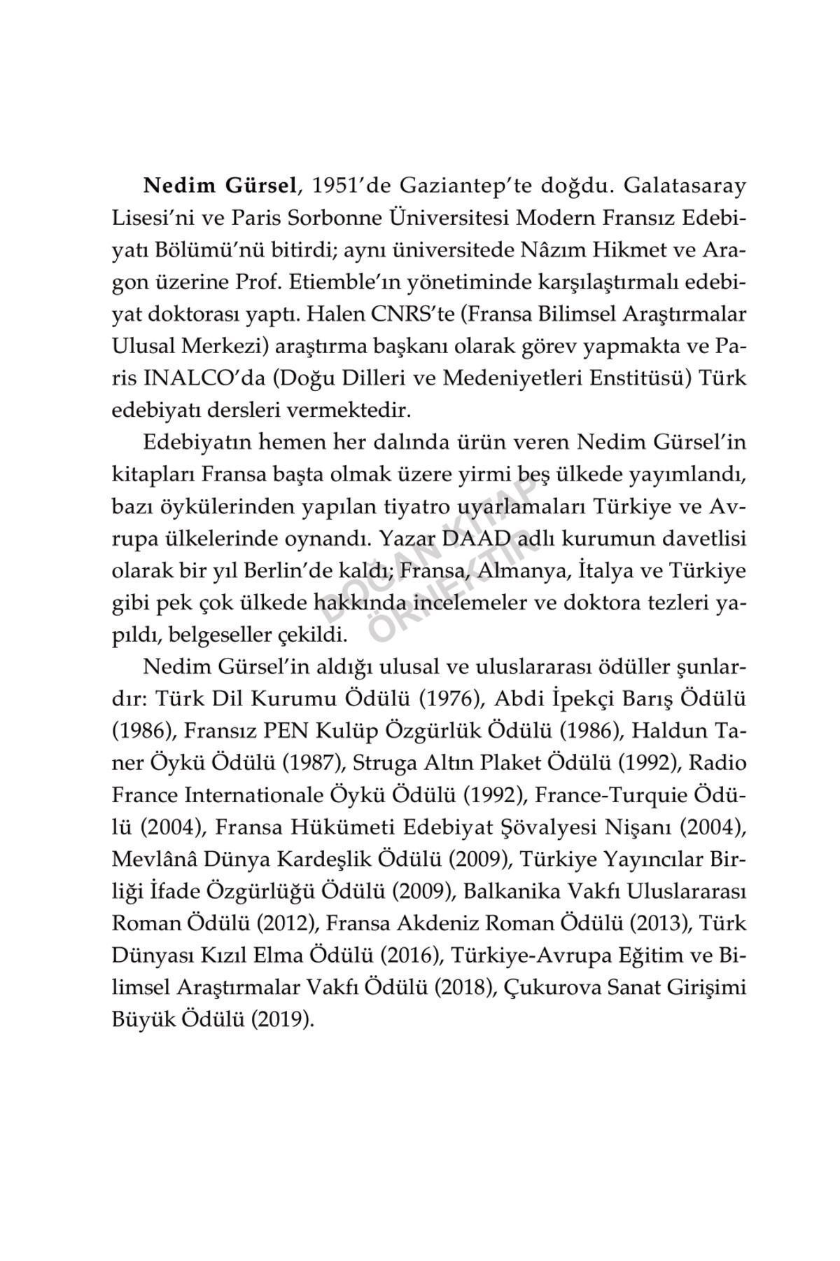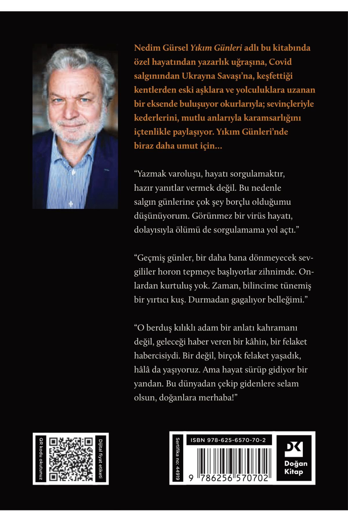 Nedim Gürsel Yıkım Günleri adlı bu kitabında özel hayatından yazarlık uğraşına, Covid salgınından Ukrayna Savaşı’na, keşfettiği kentlerden eski aşklara ve yolculuklara uzanan bir eksende buluşuyor okurlarıyla; sevinçleriyle kederlerini, mutlu anlarıyla karamsarlığını içtenlikle paylaşıyor. Yıkım Günleri’nde biraz daha umut için… “Yazmak varoluşu, hayatı sorgulamaktır, hazır yanıtlar vermek değil. Bu nedenle salgın günlerine çok şey borçlu olduğumu düşünüyorum. Görünmez bir virüs hayatı, dolayısıyla ölümü de sorgulamama yol açtı.” “Geçmiş günler, bir daha bana dönmeyecek sevgililer horon tepmeye başlıyorlar zihnimde. Onlardan kurtuluş yok. Zaman, bilincime tünemiş bir yırtıcı kuş. Durmadan gagalıyor belleğimi.” “O berduş kılıklı adam bir anlatı kahramanı değil, geleceği haber veren bir kâhin, bir felaket habercisiydi. Bir değil, birçok felaket yaşadık, hâlâ da yaşıyoruz. Ama hayat sürüp gidiyor bir yandan. Bu dünyadan çekip gidenlere selam olsun, doğanlara merhaba!”