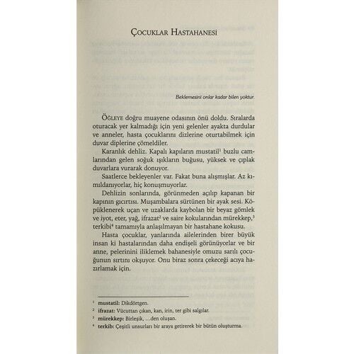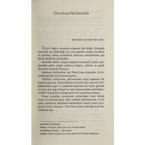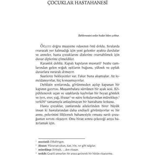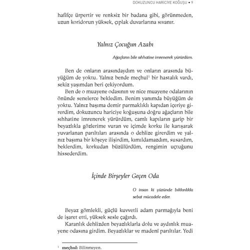 Romanın baş karakteri olan on beş yaşındaki çocuk, yaklaşık sekiz senedir dizindeki bir kemik rahatsızlığı nedeniyle tedavi görmektedir. Ancak dizindeki rahatsızlık tam olarak teşhis edilemediği için etkili bir tedavi uygulanması oldukça güçtür. Her gün hastane odalarında ve koridorlarda geçen gençlik yılları, çocuğu gitgide daha çok yıpratır. Bir yandan hastalığının sebep olduğu acılar, bir yandan da tedavi sürecinin belirsizliğinden doğan bunalım onu tedirgin, mutsuz ve özgüvensiz birine dönüştürür.