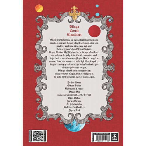 Güçlü Kurgularıyla Ve Karakterleriyle Zamana Meydan Okuyan Dünya Klasikleri, Çocuklar İçin Özel Bir Seçkiyle Bir Araya Geliyor! Define Adası’ndan Oliver Twist’e, Beyaz Diş’ten Üç Silahşorlar’a Dünya Klasikleri, Çocukların Hayal Gücünü Beslerken Evrensel Değerleri Tanımalarını Sağlıyor. Her Bir Sayfası Macera, Dostluk Ve Cesaret Dolu Öyküler, Kuşaklar Boyunca Sevgiyle Okunmaya Ve Hafızalarda Yer Edinmeye Devam Ediyor. Dünya Klasiklerinin En Sevilen On Eserinden Oluşan Bu Koleksiyonla, Büyülü Bir Dünyanın Kapısını Aralayın. Define Adası Oliver Twist Robinson Crusoe Beyaz Diş Denizler Altında 20.000 Fersah Gizli Bahçe Kayıp Dünya Üç Silahşorlar Gulliver’in Gezileri Siyah İnci