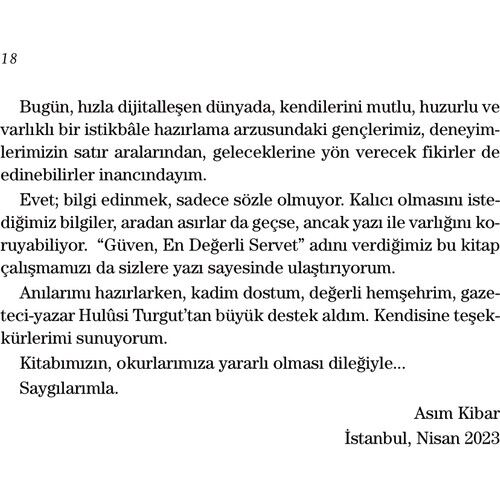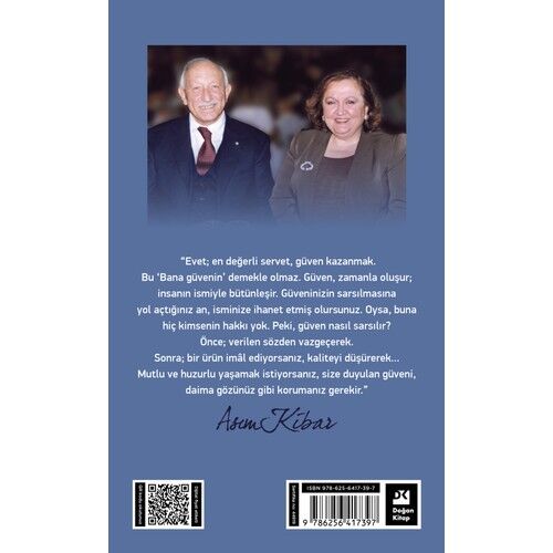 “Evet; en değerli servet, güven kazanmak. Bu ‘Bana güvenin’ demekle olmaz. Güven, zamanla oluşur; insanın ismiyle bütünleşir. Güveninizin sarsılmasına yol açtığınız an, isminize ihanet etmiş olursunuz. Oysa, buna hiç kimsenin hakkı yok. Peki, güven nasıl sarsılır? Önce; verilen sözden vazgeçerek. Sonra; bir ürün imâl ediyorsanız, kaliteyi düşürerek... Mutlu ve huzurlu yaşamak istiyorsanız, size duyulan güveni, daima gözünüz gibi korumanız gerekir.” -Asım Kibar