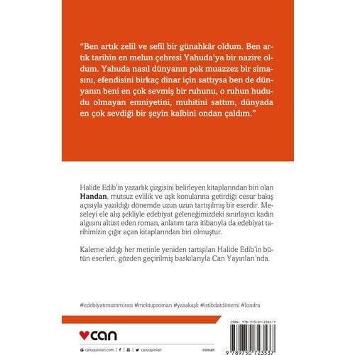 “Ben artık zelil ve sefil bir günahkâr oldum. Ben artık tarihin en melun çehresi Yahuda’ya bir nazire oldum. Yahuda nasıl dünyanın pek muazzez bir simasını, efendisini birkaç dinar için sattıysa ben de dünyanın beni en çok sevmiş bir ruhunu, o ruhun hududu olmayan emniyetini, muhitini sattım, dünyada en çok sevdiği bir şeyin kalbini ondan çaldım.”;Halide Edib’in yazarlık çizgisini belirleyen kitaplarından biri olan Handan, mutsuz evlilik ve aşk konularına getirdiği cesur bakış açısıyla yazıldığı dönemde uzun uzun tartışılmış bir eserdir. Meseleyi ele alış şekliyle edebiyat geleneğimizdeki sınırlayıcı kadın algısını altüst eden roman, anlatım tarzı itibarıyla da edebiyat tarihimizin çığır açan kitaplarından biri olmuştur.;Kaleme aldığı her metinle yeniden tartışılan Halide Edib’in bütün eserleri, gözden geçirilmiş baskılarıyla Can Yayınları’nda.;Sayfa Sayısı: 232