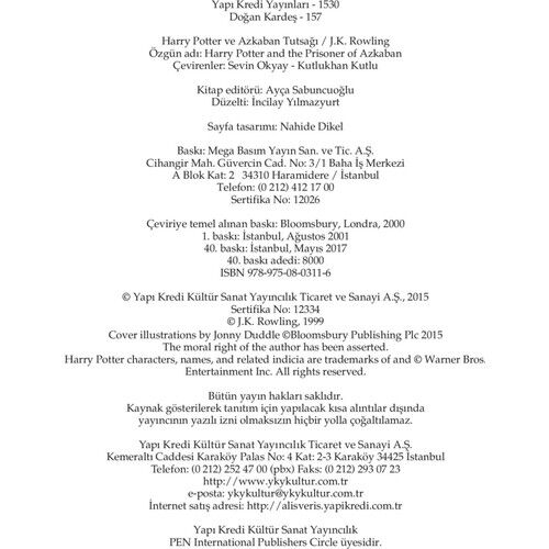 Sıra dışı kurgusu ve hiç beklenmedik olay örgüsü ile Harry Potter ve Azkaban Tutsağı Kitabı okura bir kez daha sihir ve macera dolu bir dünya sunarak, hak ettiği tüm övgülere layık olduğunu bir kez daha kanıtlıyor. Harry Potter ve Azkaban Tutsağı Fiyatı açısından da oldukça makul bir kitap. Minik aile bireyleriyle beraber okuyabileceğiniz ve sonrasında onlarla ortak bir dilde; büyücülük, Hogwarts Kalesi, Quidditch maçları ve pek çok şey üzerine derin sohbetler yapabilmenize olanak sağlayan seri, konuşmalara şahit olan ve seriyi okumamış kişilerce tuhaf karşılanabilir. Kütüphanenizde mutlaka bulundurmanız gereken Harry Potter ve Azkaban Tutsağı Kitabı, yıllar geçse de popülerliğini kaybetmeyecek bir eser.Seri 7. kitapla son buluyor ancak yazar oyun yazarları Jack Thorne ve Johhny Tiffany ile birlikte, yedinci kitaptan on dokuz yıl sonrasını konu alan ve sekizinci kitap olarak kitabı da basılan "Harry Potter ve Lanetli Çocuk" adlı iki perdelik bir tiyatro da kaleme almıştır. Ayrıca seriye ek olarak; Fantastik Canavarlar, Quidditch, Ozan Beedle ve Hogwarts üzerine yazılmış eserlerin de mevcut olduğunu Harry Potter hayranlarıyla paylaşmakta fayda var.