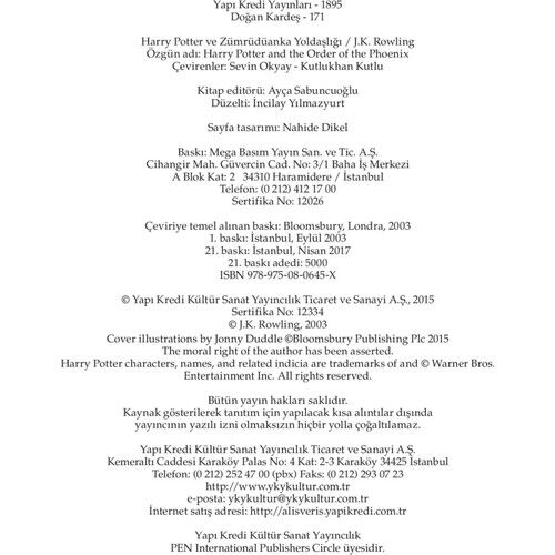 - Hogwarts Cadılık ve Büyücülük Okulu’ndaki beşinci yılında Harry, hayatını cehenneme çeviren sihirli/sihirsiz pek çok şeyle başa çıkmak zorunda: Yaz tatilini yanlarında harcadığı aptal akrabaları; beklenmedik bir anda ve yerde karşısına çıkan Ruh Emici’ler; ergenlik çağının isyanları, heyecanları, korkuları; onun gösteriş düşkünü bir yalancı olduğunu düşünenler; okulun işleyişine burnunu sokmaya çalışan Sihir Bakanlığı; gelmiş geçmiş en berbat Karanlık Sanatlara Karşı Savunma öğretmeni; ağır dersler, zor sınavlar, acımasız cezalar; sürekli yinelenen bir kâbus ve acıyan yara izi; ona en yakın insanlardan birinin ölümü; beş yıl gecikmeyle öğrendiği bir gerçek... Serinin ilk dört kitabında gözlerimizin önünde adeta etten kemikten bir büyülü dünya kuran J. K. Rowling, yaratıcılığıyla yine başrolde: Satırlara ve satır aralarına serpiştirilmiş zekice ayrıntılar, olay örgüsünü daha da zenginleştiriyor ve büyülü dünyaya yeni renkler katıyor. Bu sürükleyici kitabı elinizden bırakamayıp kalınlığıyla ters orantılı hızda okuyacak ve tıpkı Harry gibi bir sonraki okul yılını iple çekerek Hogwarts’tan ayrılacaksınız.
