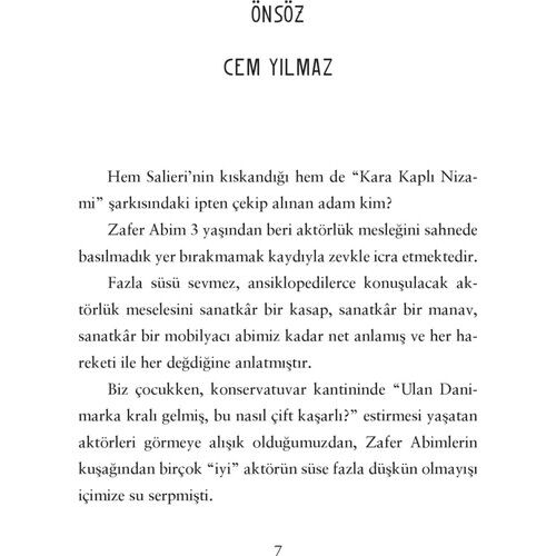 “Zafer Abimin bu yazılarını okurken gerçekten çok güldüm. Mal güzel. Müthiş bir zamanlama ile yazılmış performanslar gibiler. Bazen bu performanslara canlı tanıklık da ettim, çok şanslıyım. Hem esnek hem beton gibi sağlam öyküler. Peki, hiç düşündünüz mü nedir bunun sebebi? Ben düşündüm.