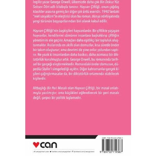 George Orwell’ın Hayvan Çiftliği, distopik anlatı türüne örnek bir roman olarak karşınıza çıkıyor. Çiftlikte geçen hikayede yazar, insanlar ve hayvanlar arasındaki hiyerarşik düzeni temel alarak toplumsal bir eleştiri yapıyor. 1940’lardaki reel sosyalizmin eleştirisi olan roman, dünya edebiyatında hatırı sayılır bir yere sahip olması ile okuyucuların ilgisini çekiyor. Can Yayınları’nın, Utku Lomlu’ya ait yeni kapak tasarımı ile bastığı Hayvan Çiftliği kitabı, Celal Üster çevirisi ile sunuluyor.Distopya sevenlerin okuma listesinde ilk sıralarda olan Hayvan Çiftliği, Goodreads gibi paylaşım sitelerinde de epeyce geniş yer tutuyor. Okurların beğenisini kazanan kitap, hakkında çok sayıda yorum yapılmasına olanak tanıyor.