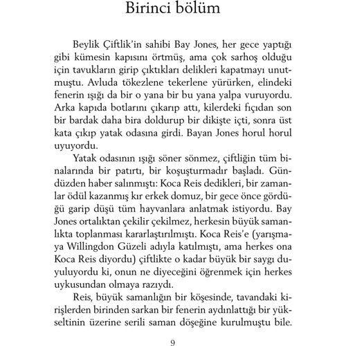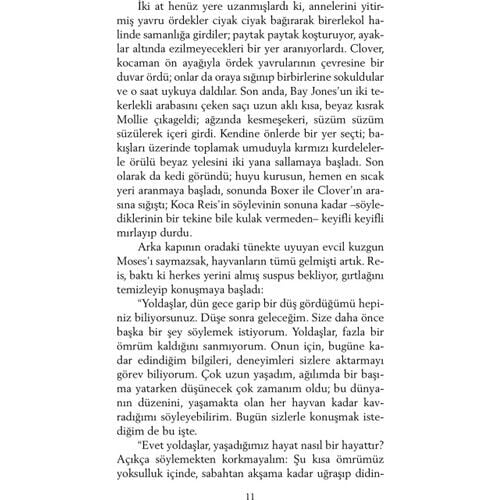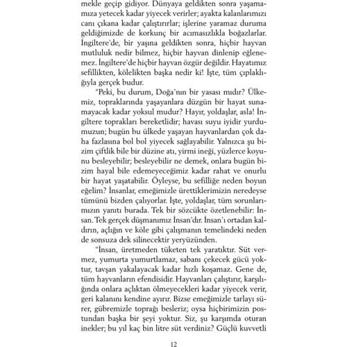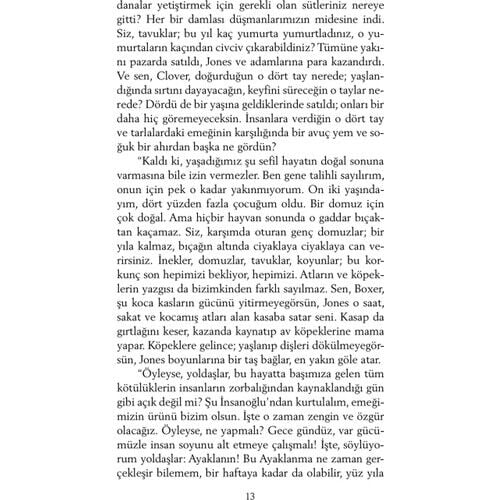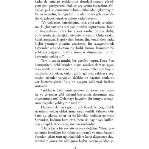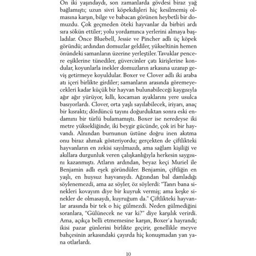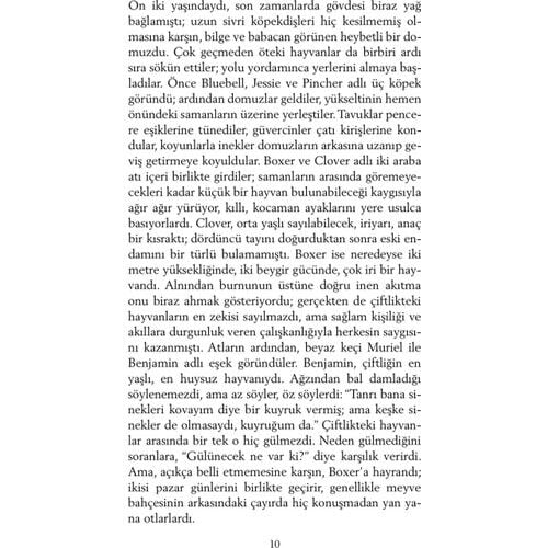 Hayvan Çiftliği - George Orwell İngiliz yazar George Owell 81903-1950), ülkemizde daha çok Bindokuzyüzseksendört adlı kitabıyla tanınır. Hayvan Çiftliği, onun çağdaş klasikler arasına girmiş ikinci ünlü yapıtıdır. 1940'lardaki ''reel sosyalizm''in eleştirisi olan bu roman, dünya edebiyatında ''yergi'' türünün başyapıtlarından biridir. Hayvn Çiftliği''nin kişleri hayvanlardır. Bir çiftlikte yaşayan hayvanlar, kendilerini sömüren insanlara başkaldırıp çiftliğin yönetimini ele geçirirler. Amaçları daha eşitlikçi bir topluluk oluşturmaktadır. Aralarında en akıllı olanlar domuzlar; kısa sürede önder bir takım oluştururlar, devrimi de onlar yolundan saptırırlar. Ne yazık ki insanlardan daha baskıcı, daha acımasız bir diktatörlük kurulmuştur artık. George Orwell, bu romanında tarihsel bir gerçeği eleştirmektedir. Romanındaki önder domuzun, düpedüz Stalin'i simgelediği açıkça görülecektir. Öbür kişiler bire bir belli olmasalar da, bir diktatörlük ortamında olabilecek kişilerdir. Romanın altı başlığı bir Peri Masalı'dır. Küükleri eğlendirecek bir peki masalı değildir; ama roman, bir masal anlatımıyla yazılmıştır.