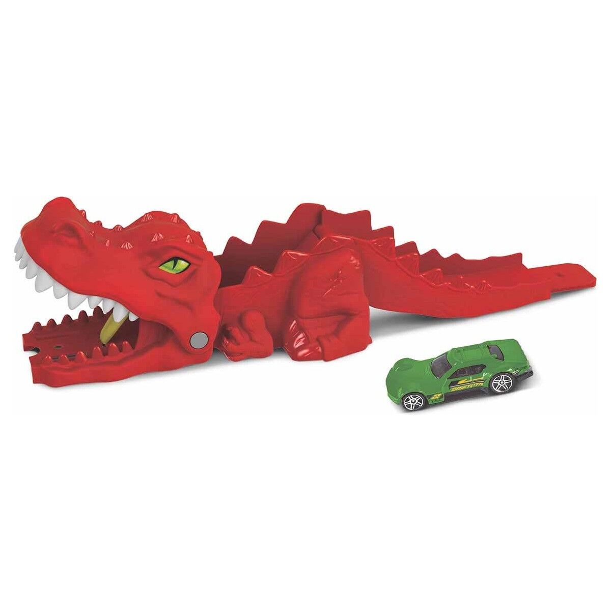 Hot Wheels Dinozor Fırlatıcı ve Hot Wheels Köpek Balığı Fırlatıcı, T-Rex ve köpek balığı şeklinde havalı fırlatıcılar ve Hot Wheels Şehri (Ayrı olarak satılır.) dünyasının zorluklarını içerir. Arabalarınızı yeterince güçlü fırlatmazsanız canavarların ağızlarına takılma riskiyle karşılaşırsınız.