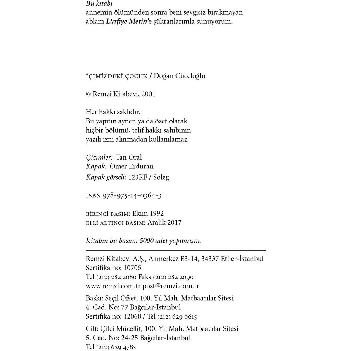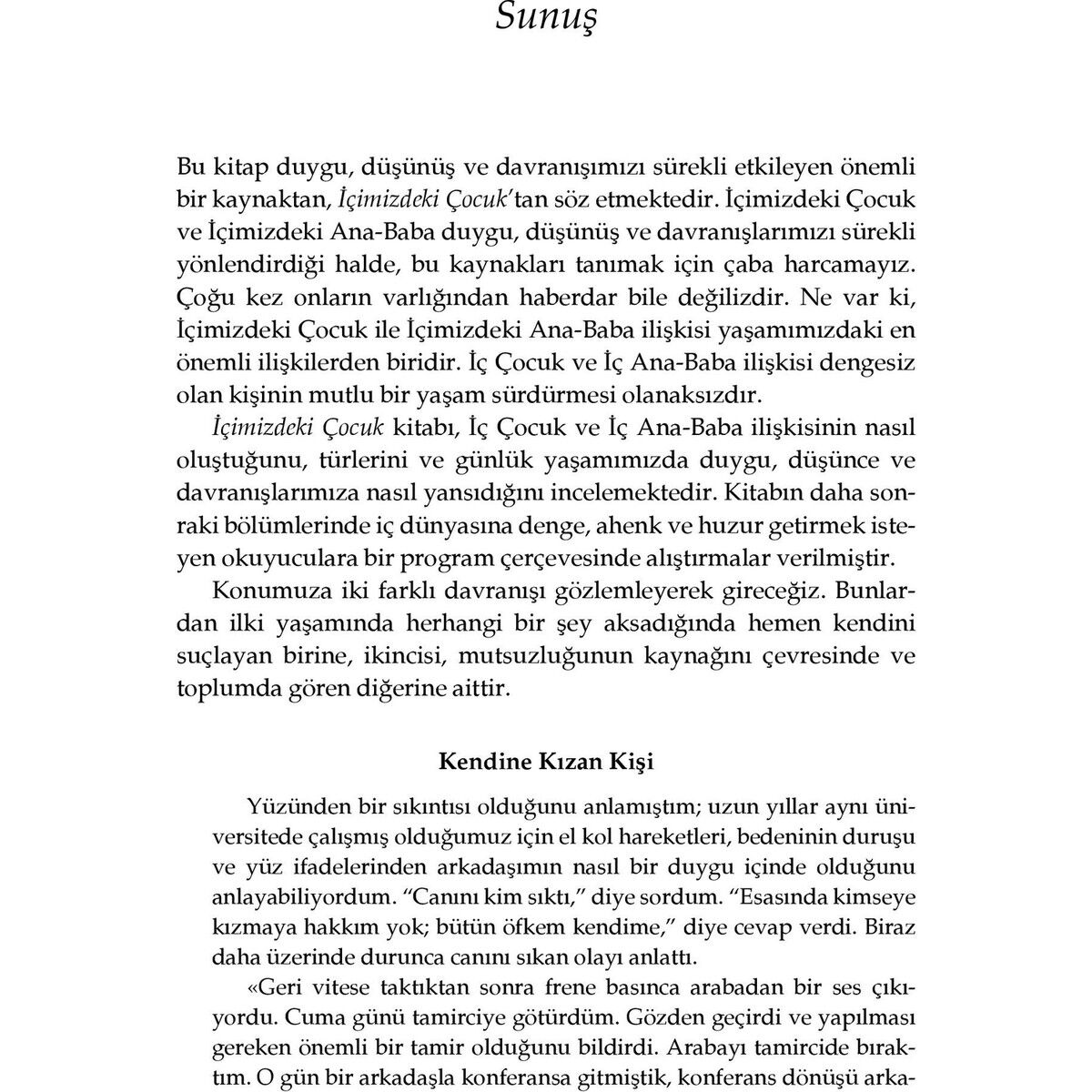 Remzi Kitabevi tarafından 254 sayfa olarak yayımlanan kitap, yalın anlatımı ile ön plana çıkıyor. Bireyin duygu ve düşünce dünyasının çevresel faktörler tarafından nasıl etkilendiğini ve kişilerin iç dünyalarının nasıl şekillendiğini konu alan kitap, sorunlarla başa çıkmada kullanılacak yöntemlere değiniyor. Olgunlaşmanın bedenen değil; ruhen gerçekleştiğini ifade eden İçimizdeki Çocuk kitabı, büyümenin yalnızca fiziksel olarak ele alınmaması gerektiği vurgusunu yapıyor. İçimizdeki çocuğu geliştirirken dış etkenlerin varlığını hesaba katmamızın önemli olduğunu belirten yazar, kişilerin bu konuda kendilerini objektif olarak sorgulamaları gerektiğini ifade ediyor.