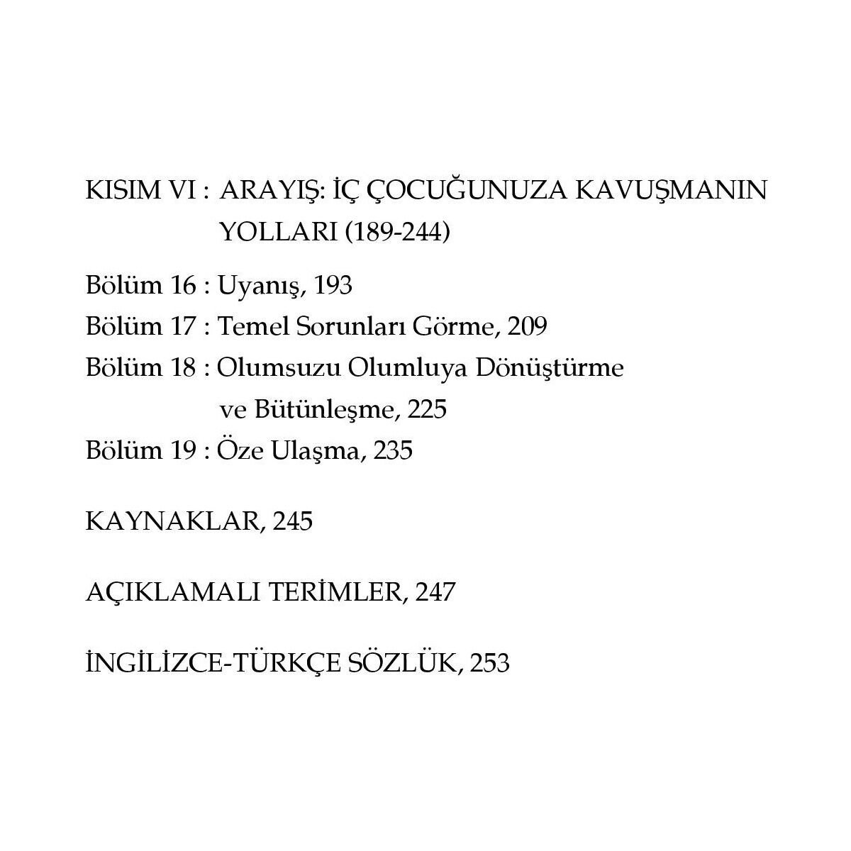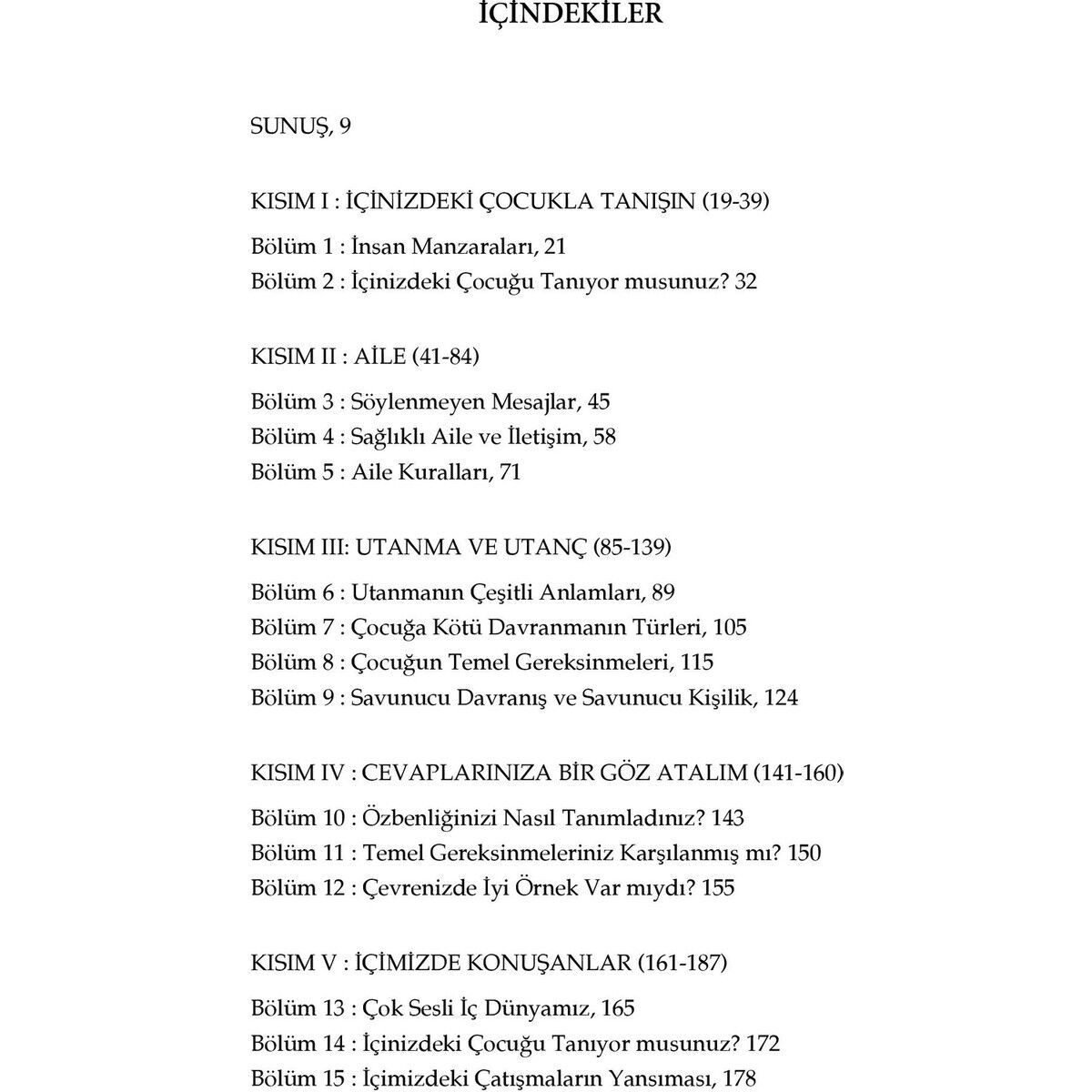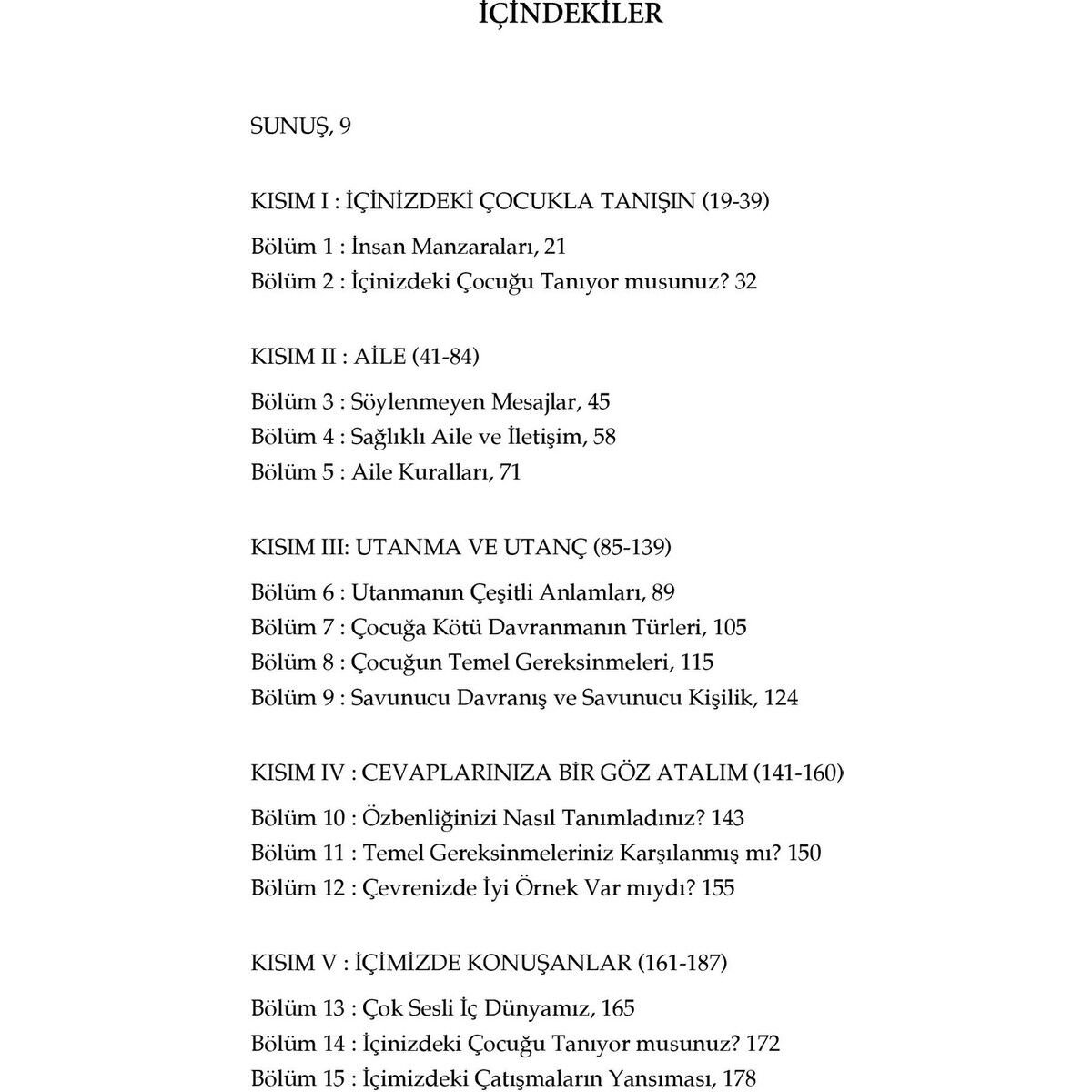 Bireyler, içine doğdukları ailenin kuralları ile büyüyor ve çoğu zaman, anne ve babaları başta olmak üzere, çevrelerinde bulunan kişilerin onaylarını almak için çabalıyor. Bir insanın, daima başkalarına bağlı kalarak hayatını yaşayıp yaşayamayacağını sorgulayan yazar, kitap içerisinde çeşitli kişilik yapısı örneklerine yer veriyor. Bireylerin, kendilerinde var olduğunu düşündükleri sorunları çözüme ulaştırmak için çabalamaları gerekiyor ve bunun için yapılan hataların görmezden gelinmemesi, büyük önem taşıyor. Kitapta, bireylerin hatalarını görmezden gelmek yerine onlarla yüzleşmelerinin, özgüvenlerinin gelişimine olumlu katkı sağlayacağı belirtiliyor. İçimizdeki Çocuk kitabı, kişilerin kendileriyle yüzleşmelerine yardımcı olmak amacıyla birçok test ve anket içeriyor. Testler ve anketlere verilecek "evet" ya da "hayır" cevapları, bireylerin kendilerini ve duygularını analiz etmelerine rehberlik ediyor. Hayatta bir şeyleri düzeltmek ve hayalleri gerçekleştirmek için geç olmadığının bilincine varılması gerektiğini ifade eden kitap, kişilerin kendilerine inanmaları ve özveriyle hareket etmeleri gerektiğinin altını çiziyor.