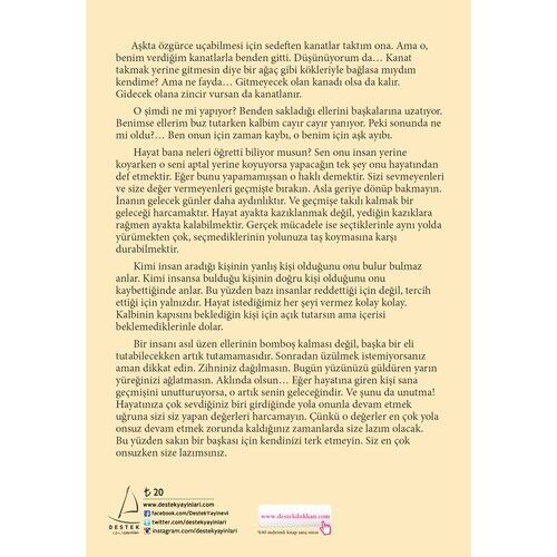 Aşkta özgürce uçabilmesi için sedeften kanatlar taktım ona. Ama o, benim verdiğim kanatlarla benden gitti. Düşünüyorum da… Kanat takmak yerine gitmesin diye bir ağaç gibi kökleriyle bağlasa mıydım kendime? Ama ne fayda… Gitmeyecek olan kanadı olsa da kalır. Gidecek olana zincir vursan da kanatlanır.