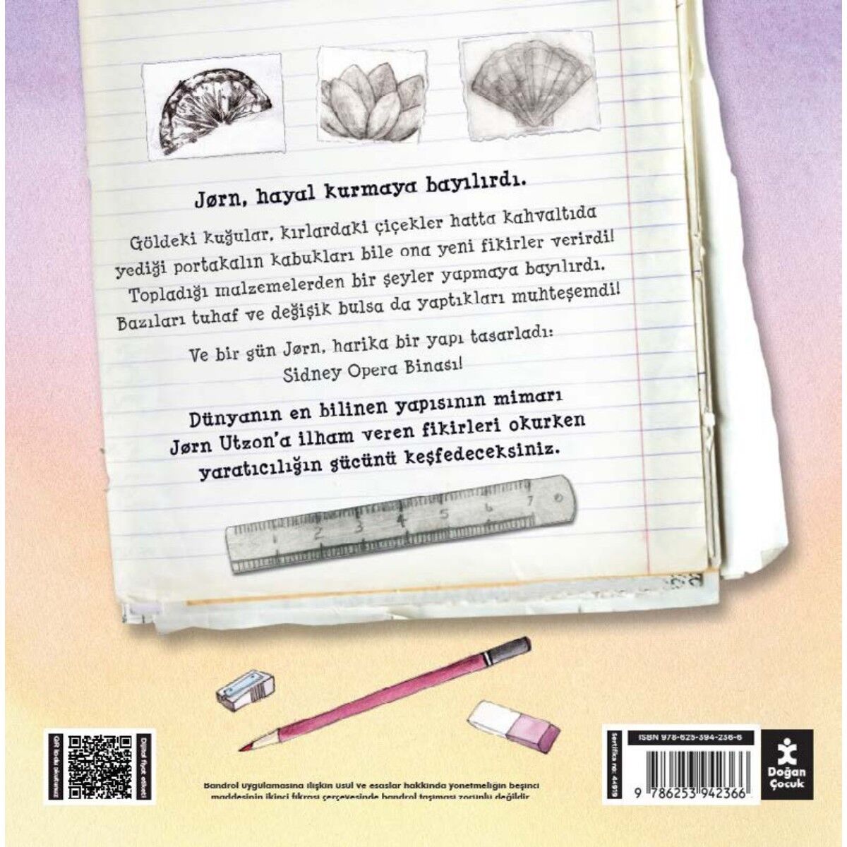 Jorn, Hayal Kurmaya Bayılırdı. Göldeki Kuğular, Kırlardaki Çiçekler Hatta Kahvaltıda Yediği Portakalın Kabukları Bile Ona Yeni Fikirler Verirdi! Topladığı Malzemelerden Bir Şeyler Yapmaya Bayılırdı. Bazıları Tuhaf Ve Değişik Bulsa Da Yaptıkları Muhteşemdi! Ve Bir Gün Jorn, Harika Bir Yapı Tasarladı: Sidney Opera Binası! Dünyanın En Bilinen Yapısının Mimarı Jorn Utzon’a İlham Veren Fikirleri Okurken Yaratıcılığın Gücünü Keşfedeceksiniz.